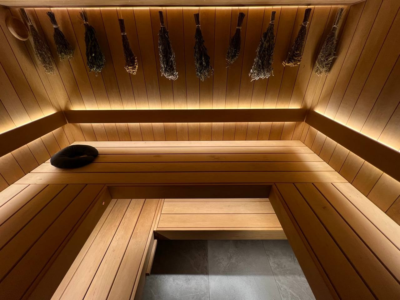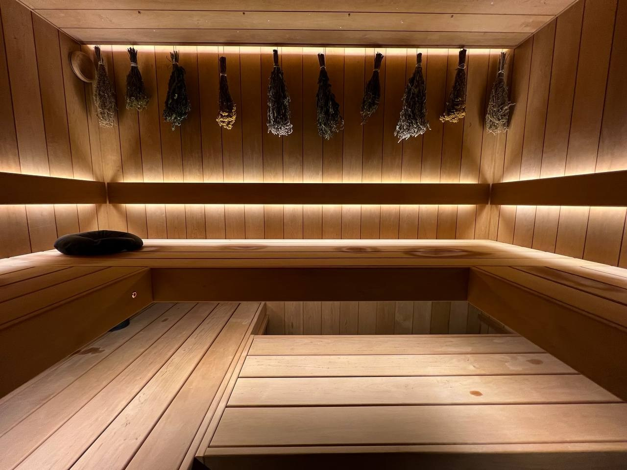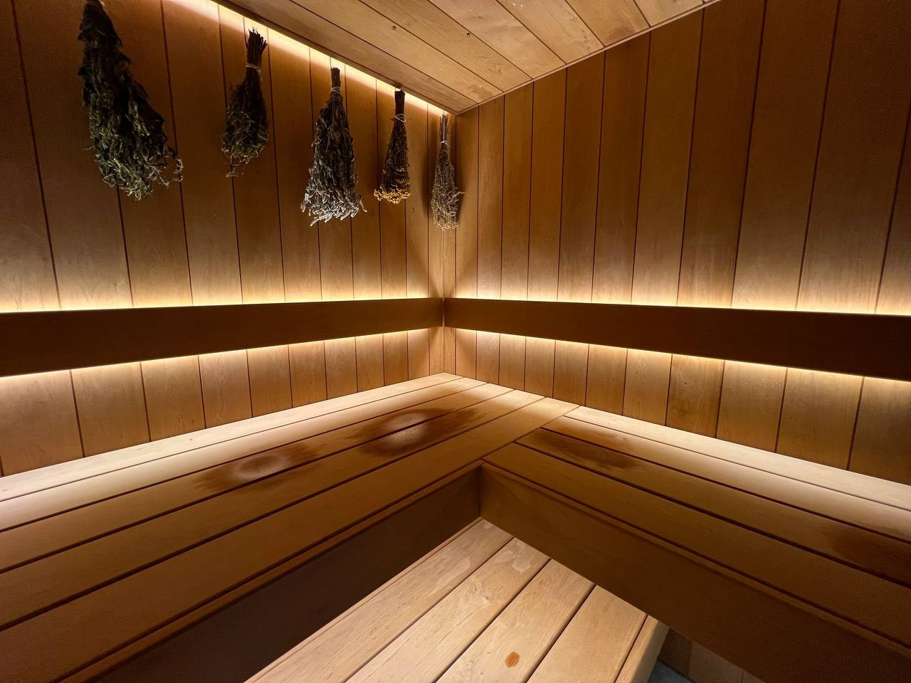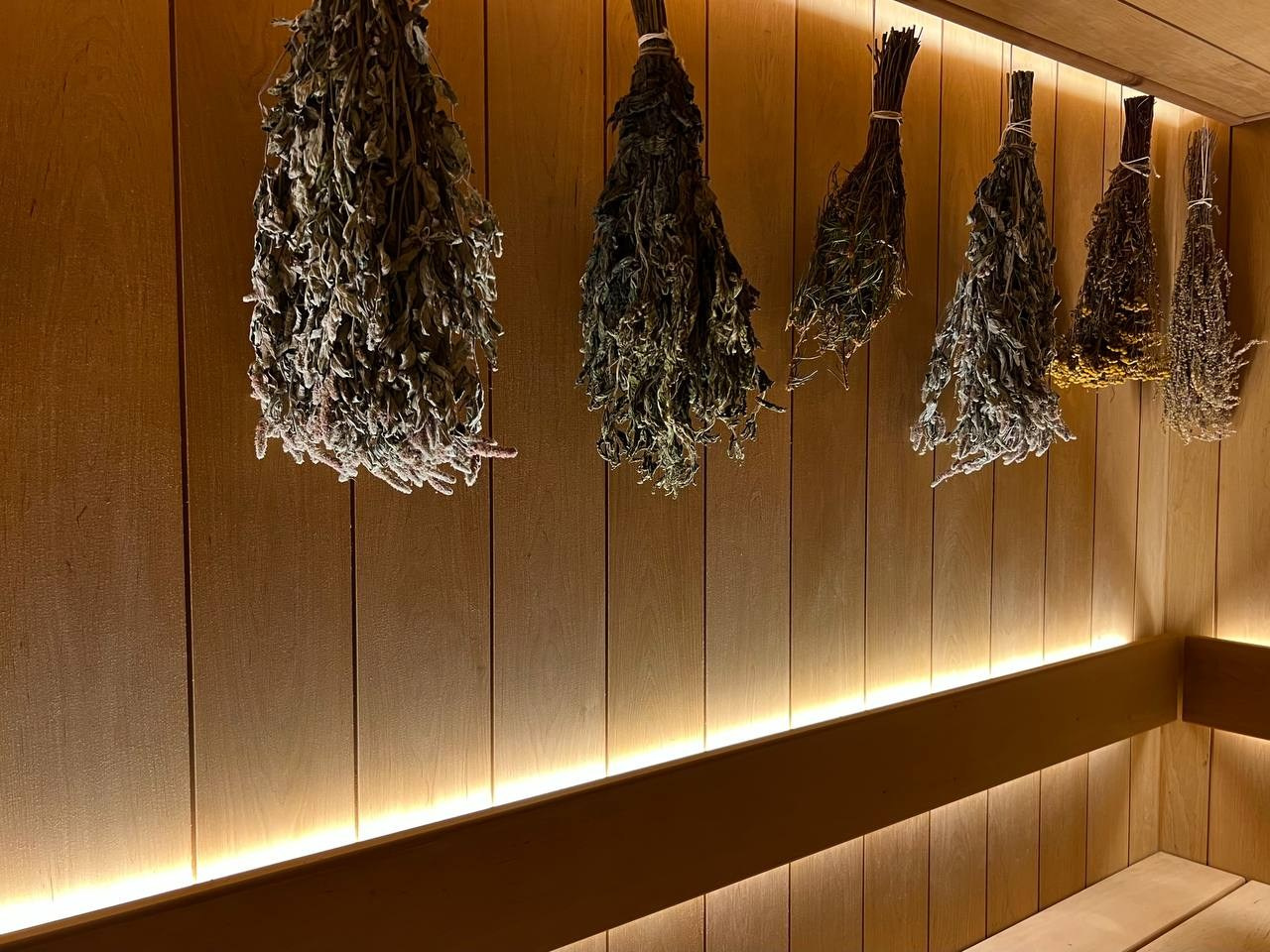 Атмосферная парная в Садах Времени с большим панно из гиммалайской соли, сеном с горных лугов Крыма и теплой линейной подсветкой