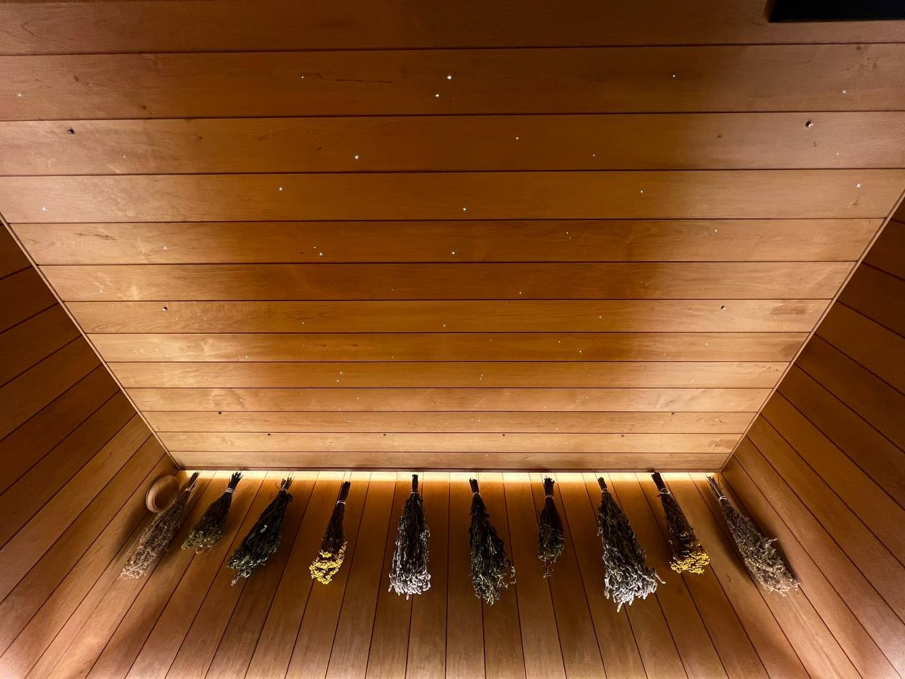Парная в Лесколово для Saunaispa: впечатляющее можжевеловое панно в половину потолка и звёздное небо на второй.