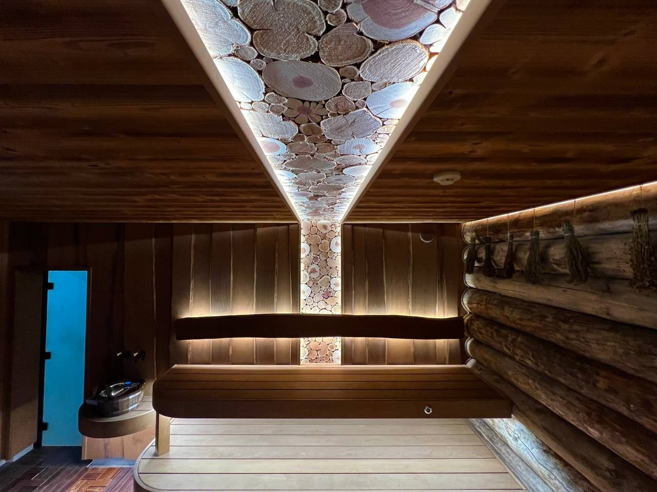 Парная в Лесколово для Saunaispa: впечатляющее можжевеловое панно в половину потолка и звёздное небо на второй.