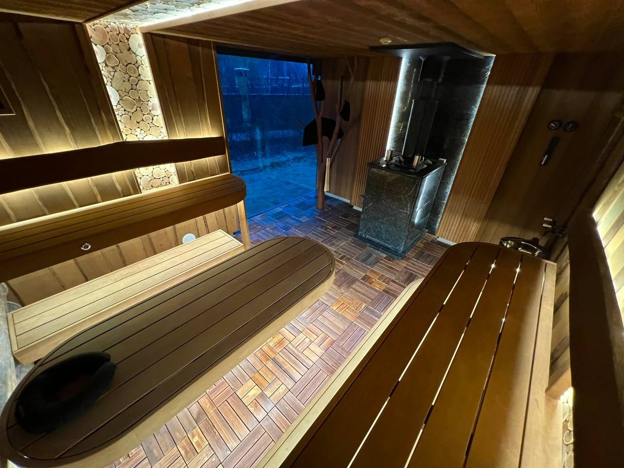 Роскошная парная в Красноармейском с высоким потолком, широкими полками, панорамным окном и Harvia Legend на дистанционном управлении