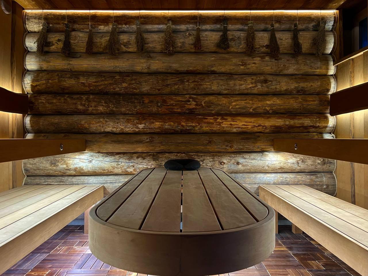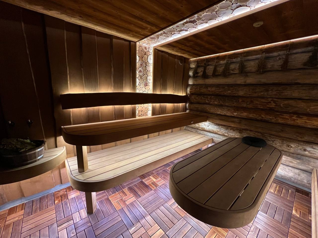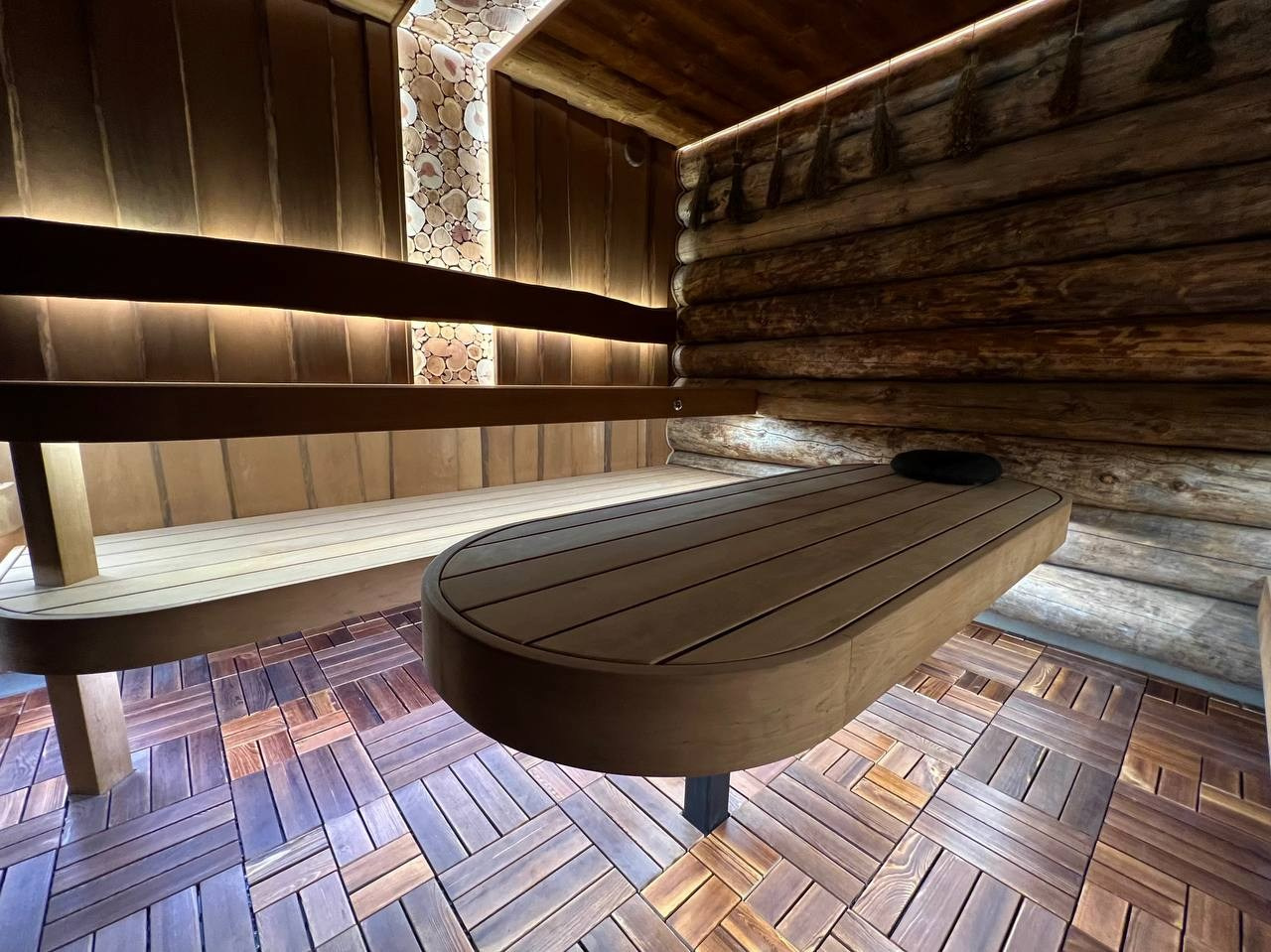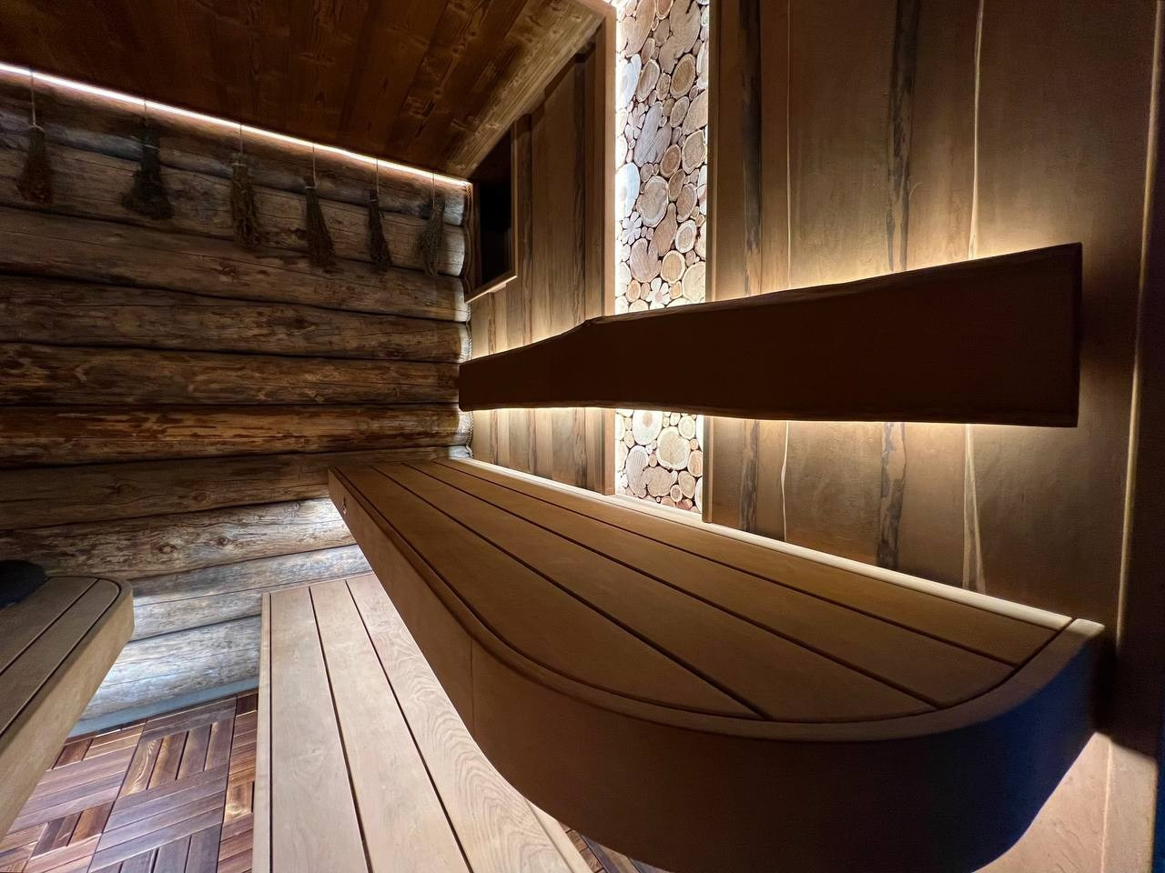Атмосферная парная в Садах Времени с большим панно из гиммалайской соли, сеном с горных лугов Крыма и теплой линейной подсветкой
