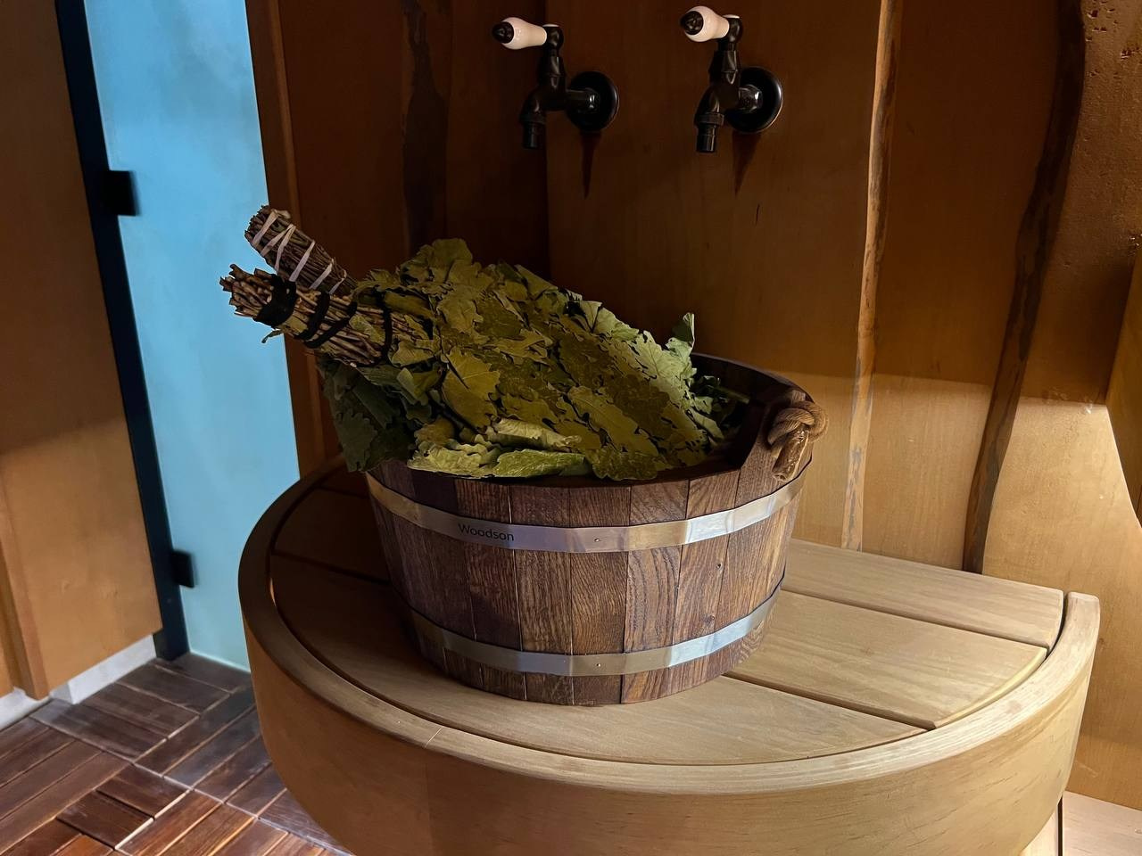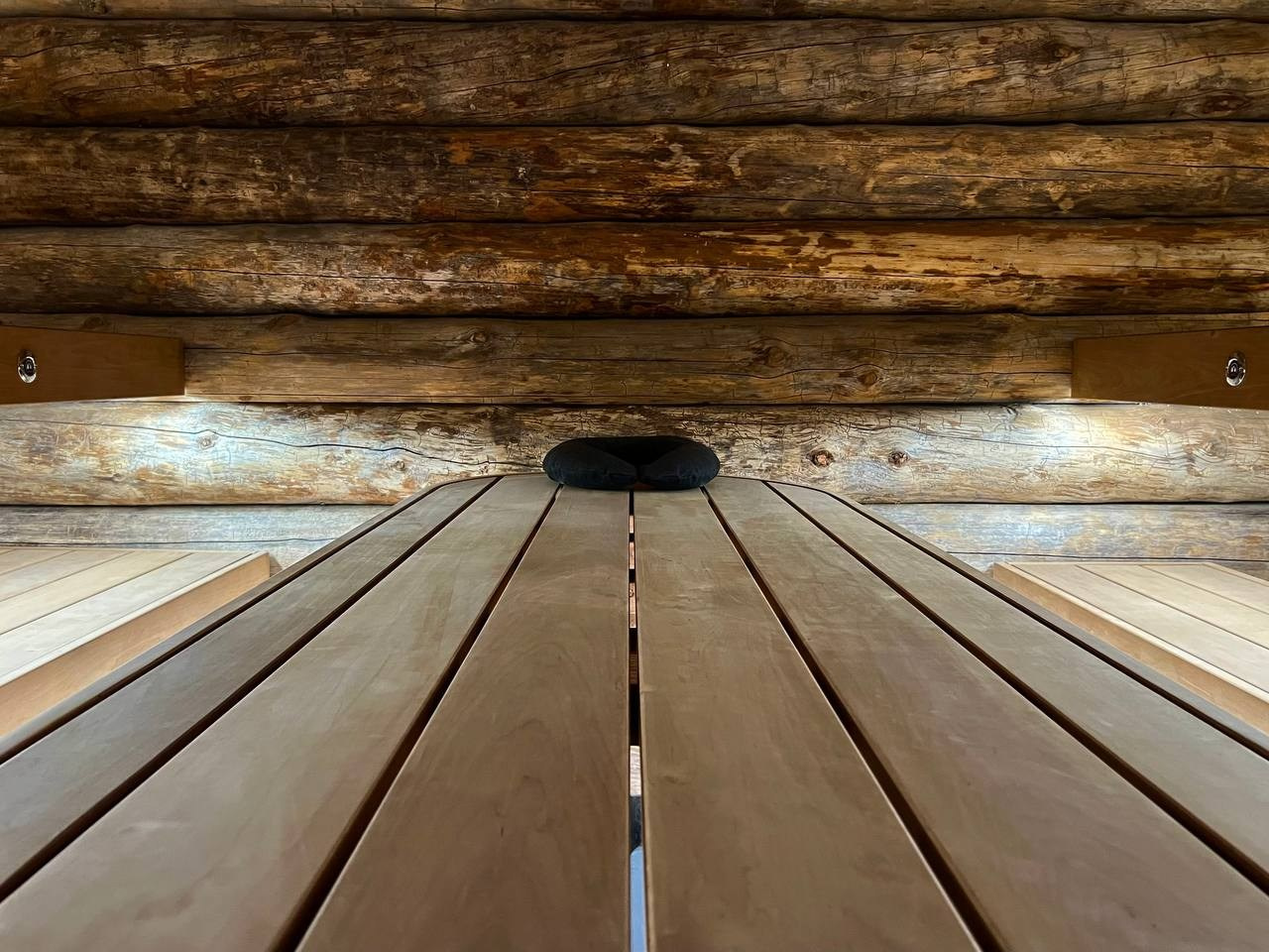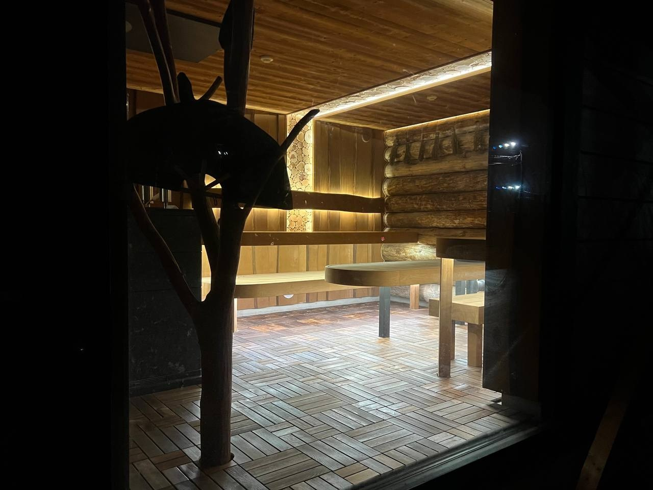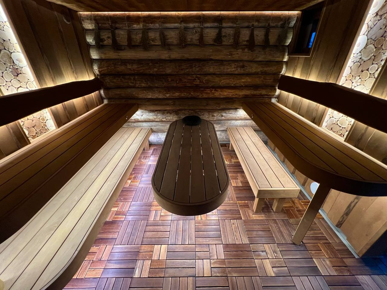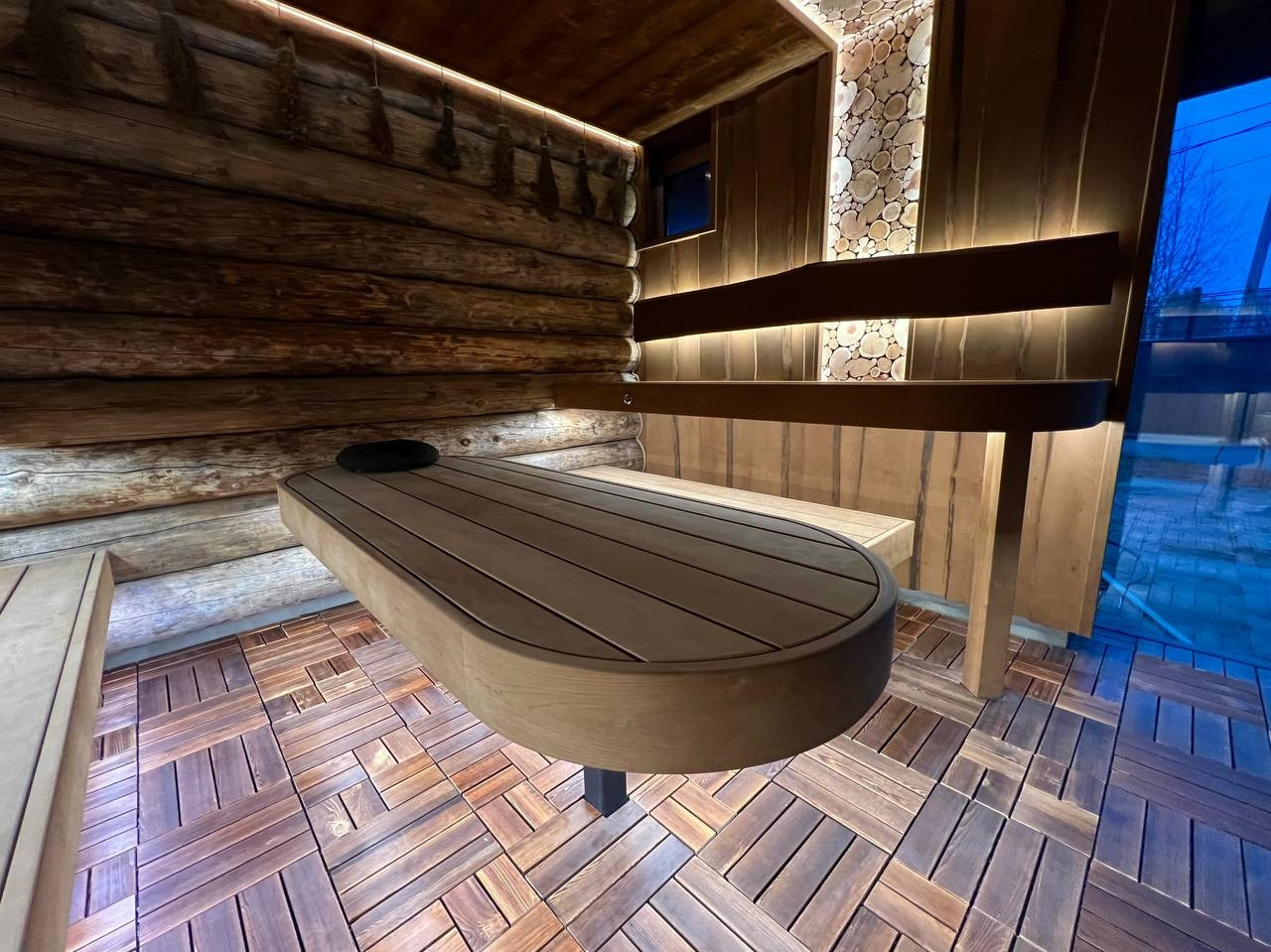 Атмосферная парная в Садах Времени с большим панно из гиммалайской соли, сеном с горных лугов Крыма и теплой линейной подсветкой