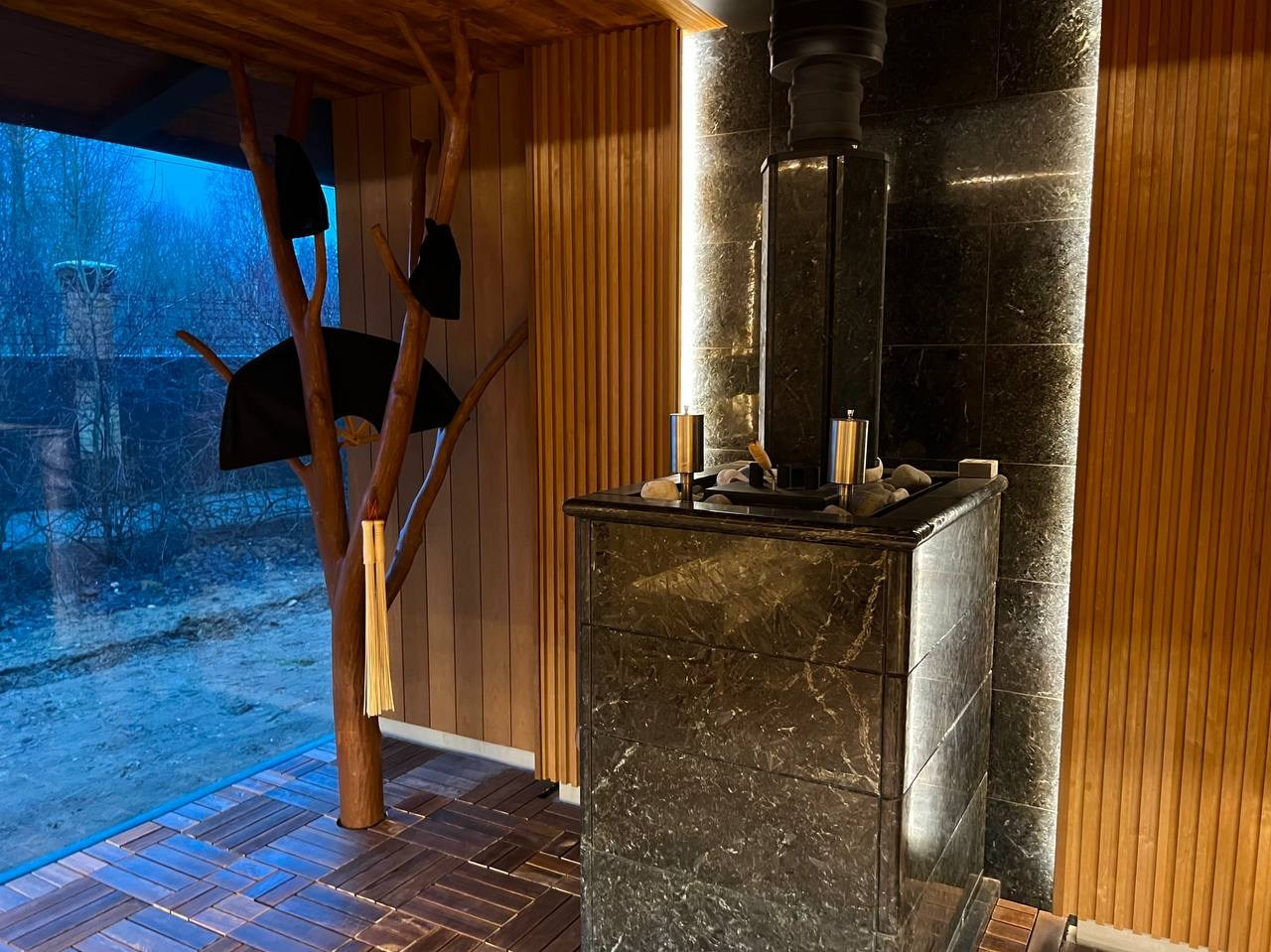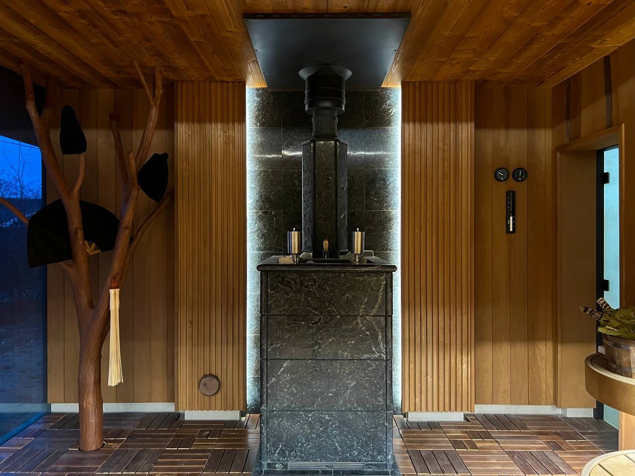 Новинка- Sangens в керамической облицовке со встроенным управлением, вокруг которой создана сауна из термоосины в Охтинском Парке