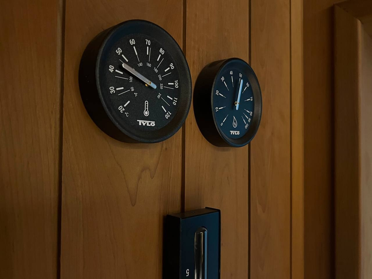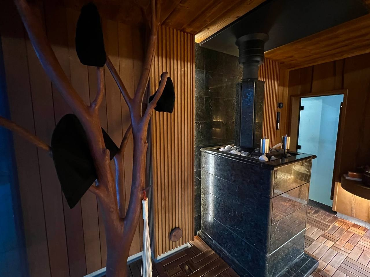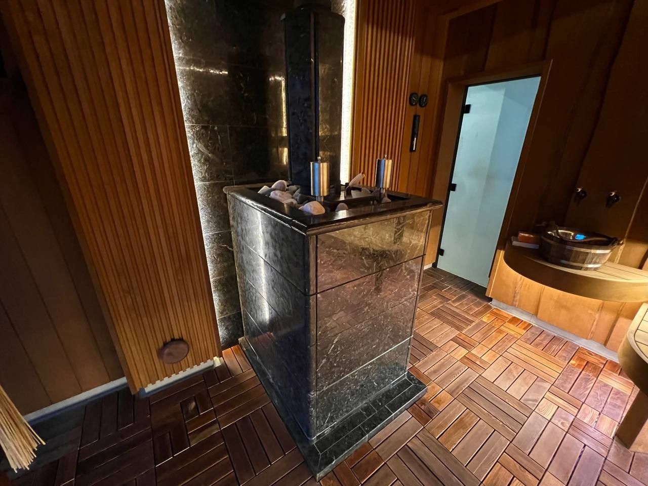 Сауна в Садах Времени на электрокаменке Sangens в облицовке из черного закаленного стекла. Выполнена в классическом стиле нашей команды