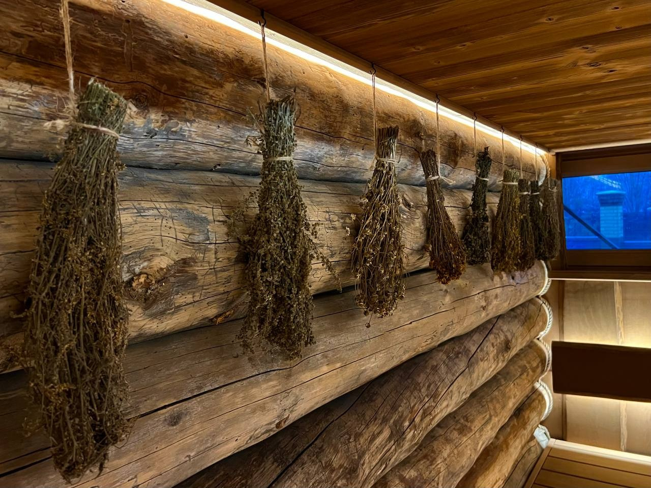 Компактная сауна в Вартемягах: термоольха, закарнизная подсветка, можжевеловое панно и крымское разнотравье. В пологе- Harvia Cilindro
