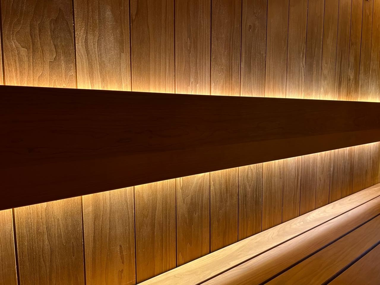 Сауна в Encore Fitness по проекту наших коллег из MBSaun. Симметрия, строгие линии, столярные элементы и щипотка роскоши