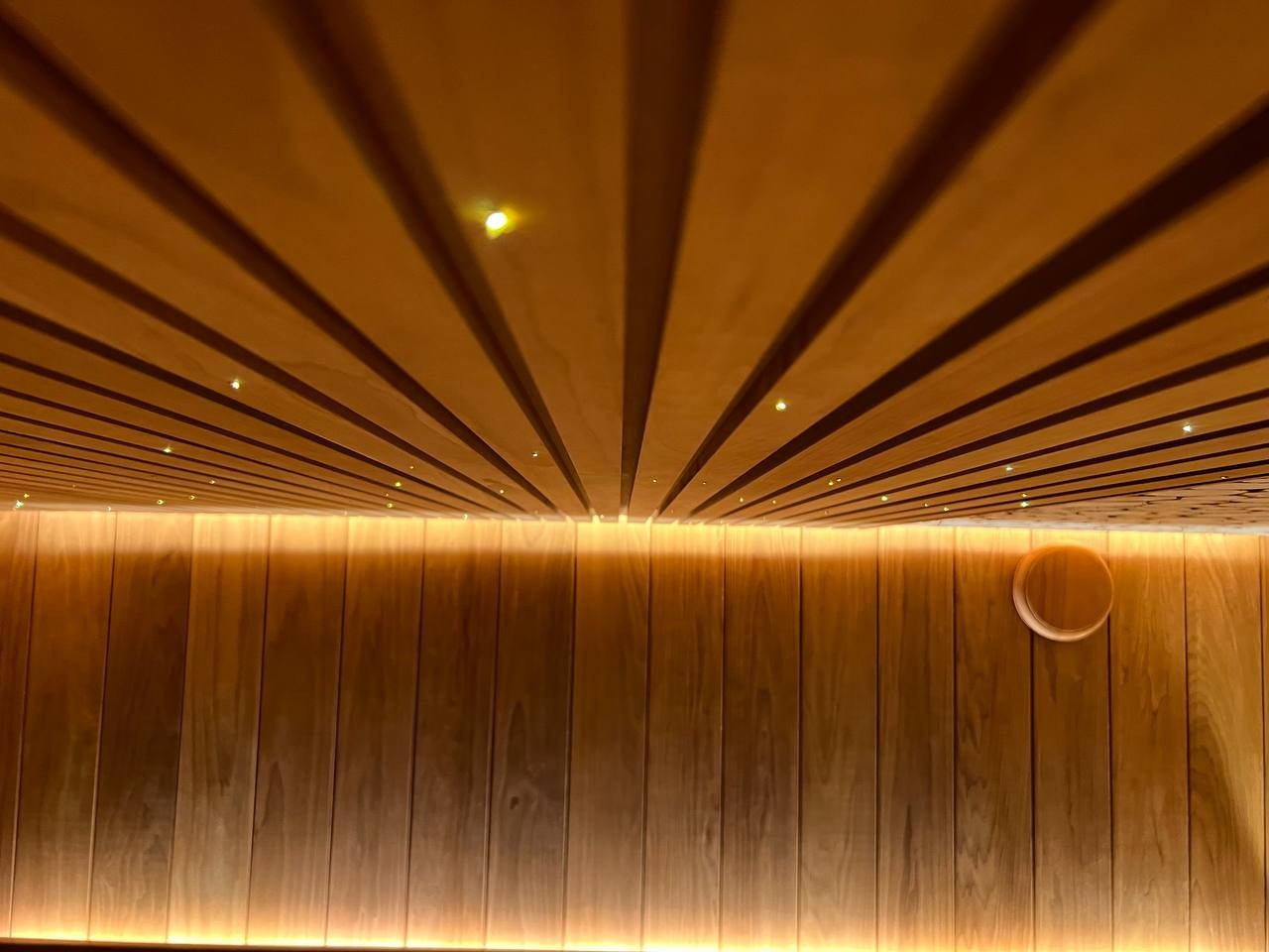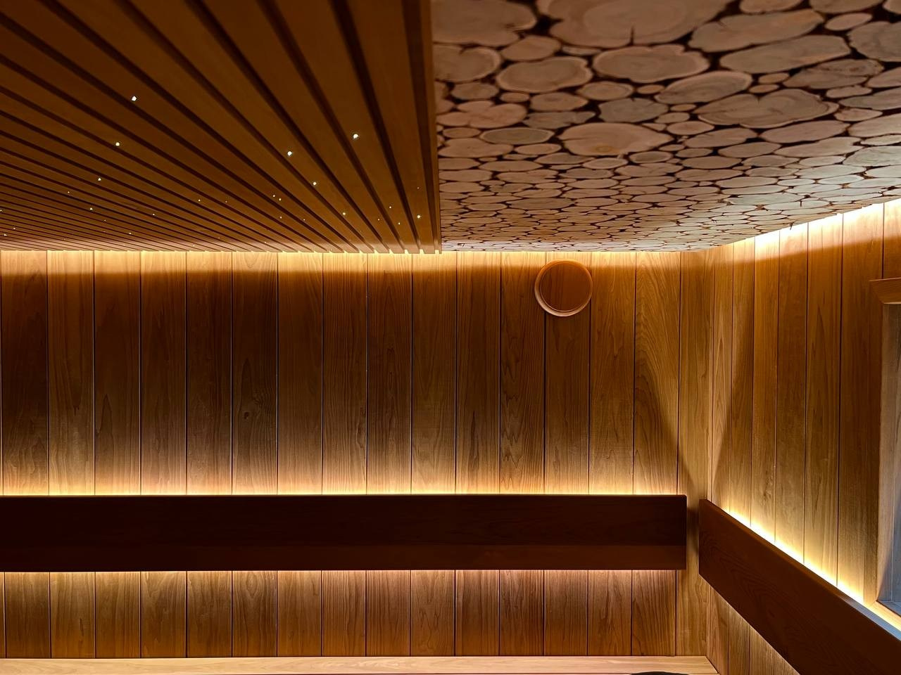 Парная в Лесколово для Saunaispa: впечатляющее можжевеловое панно в половину потолка и звёздное небо на второй.