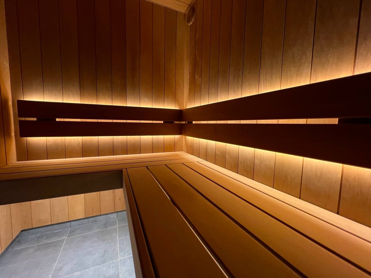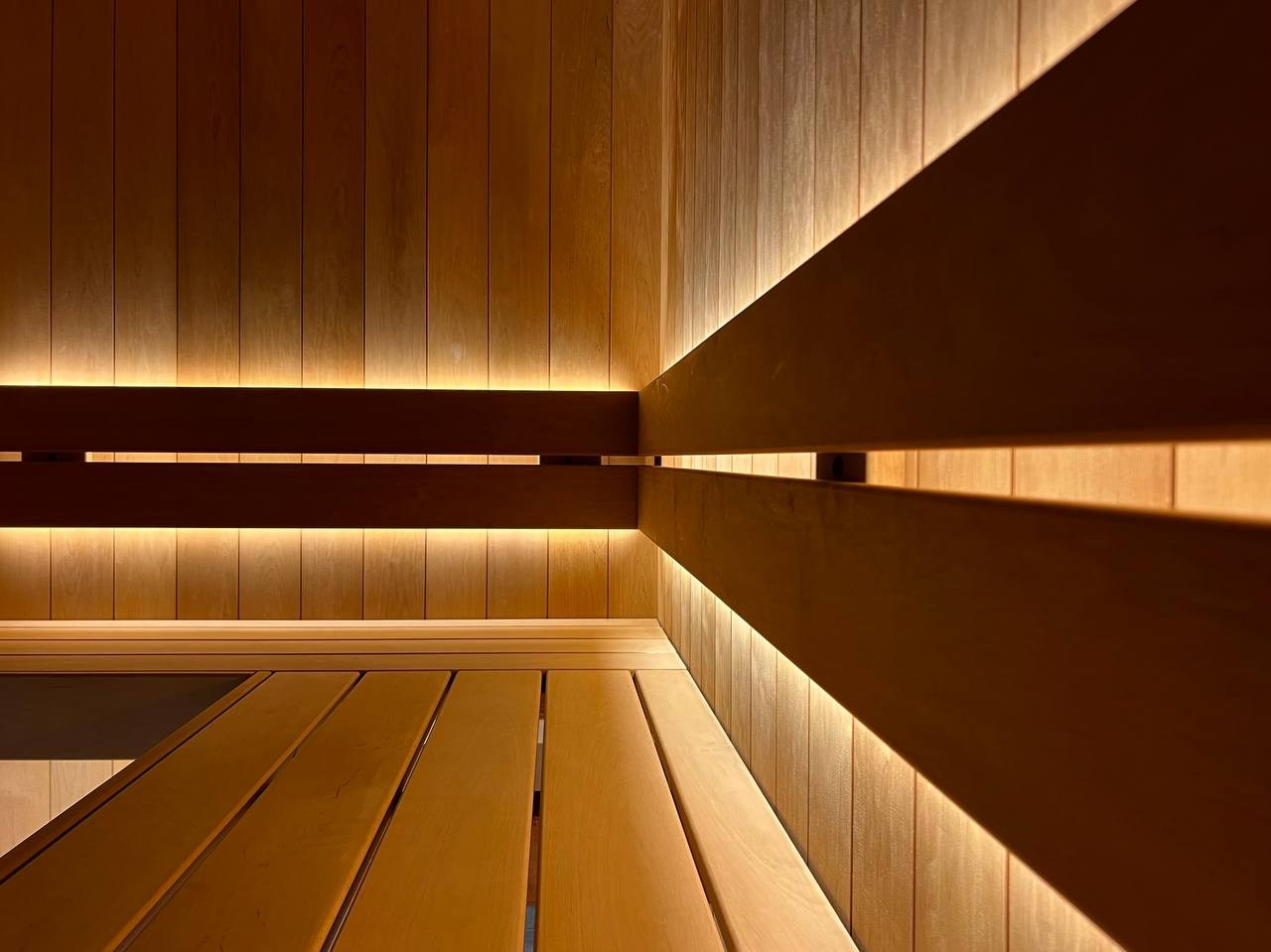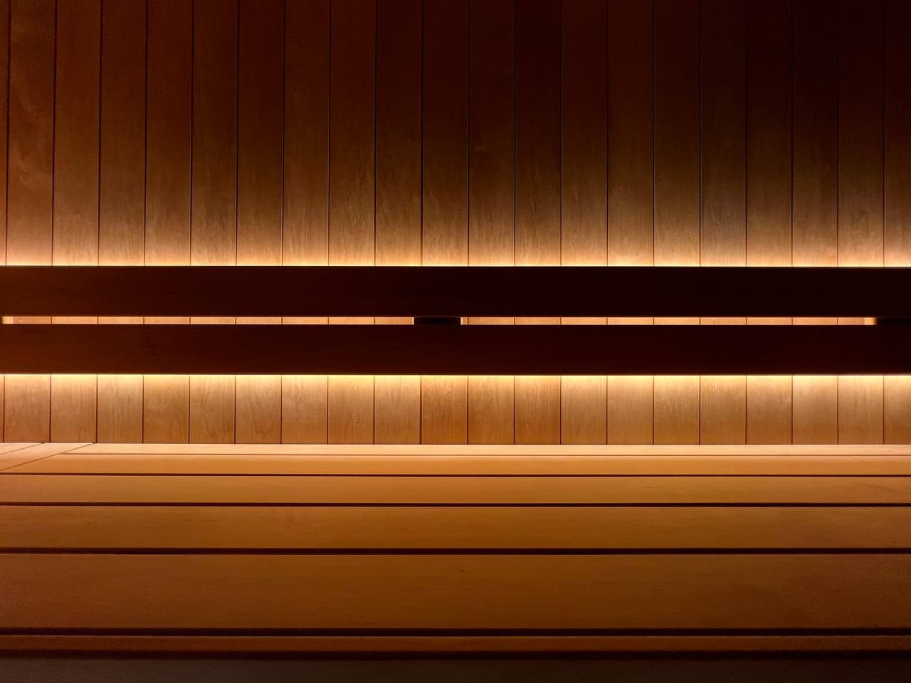 Атмосферная парная в Садах Времени с большим панно из гиммалайской соли, сеном с горных лугов Крыма и теплой линейной подсветкой