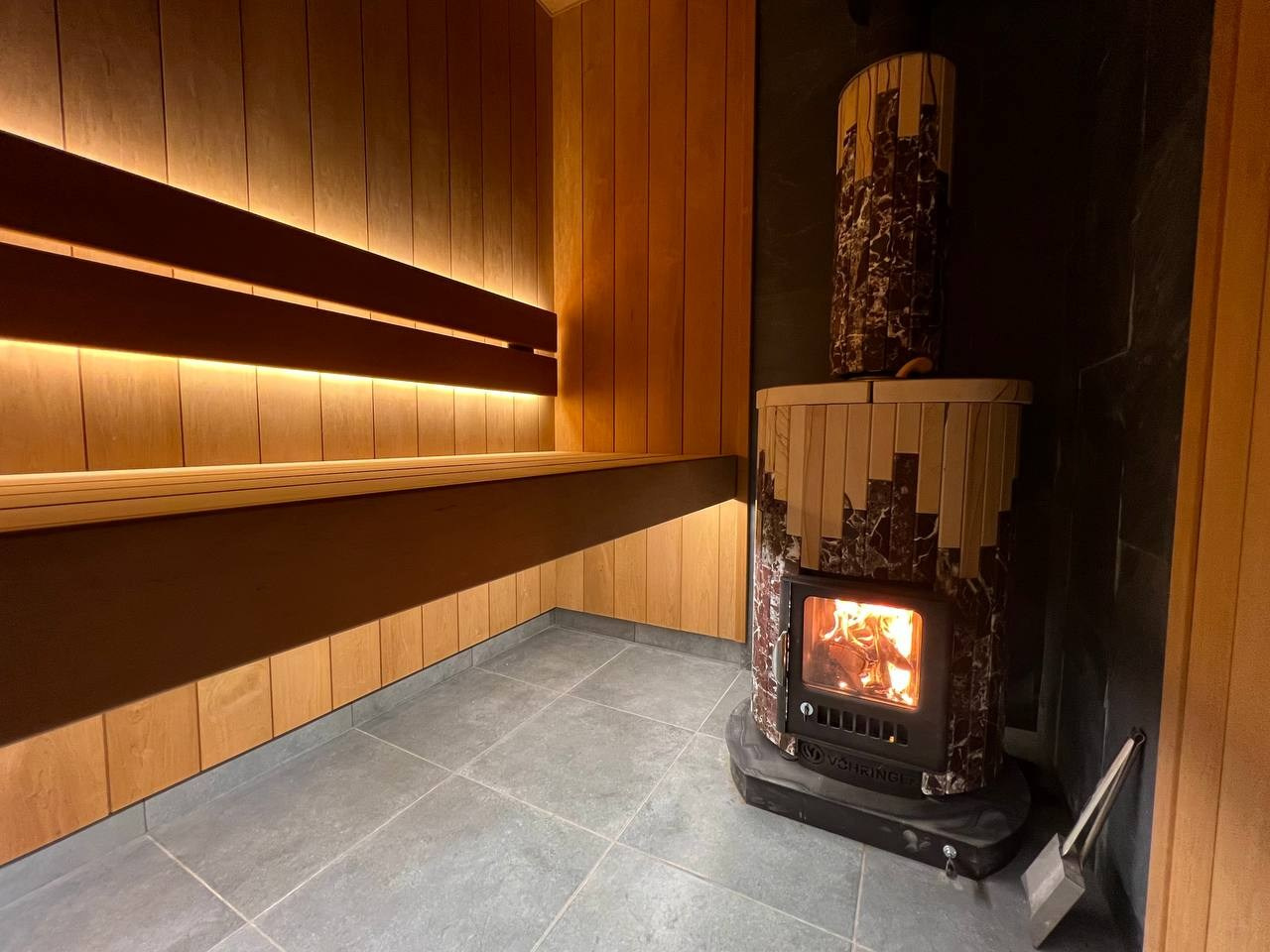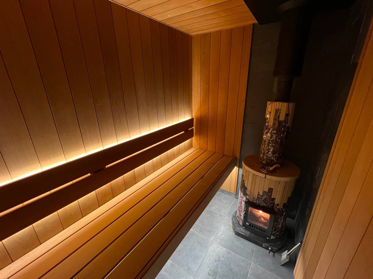 Уютная парная в Колтушах: внутренняя топка, печь в редкой облицовке, термоольха и тёплая линейная подсветка