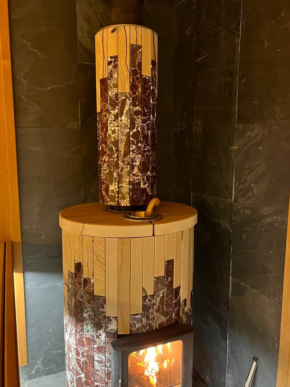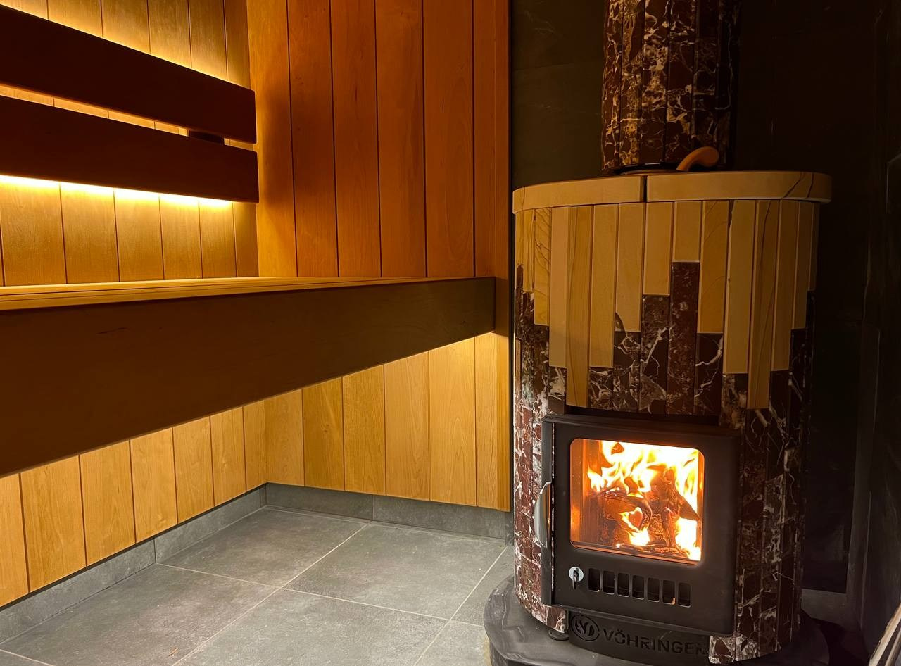 Новинка- Sangens в керамической облицовке со встроенным управлением, вокруг которой создана сауна из термоосины в Охтинском Парке