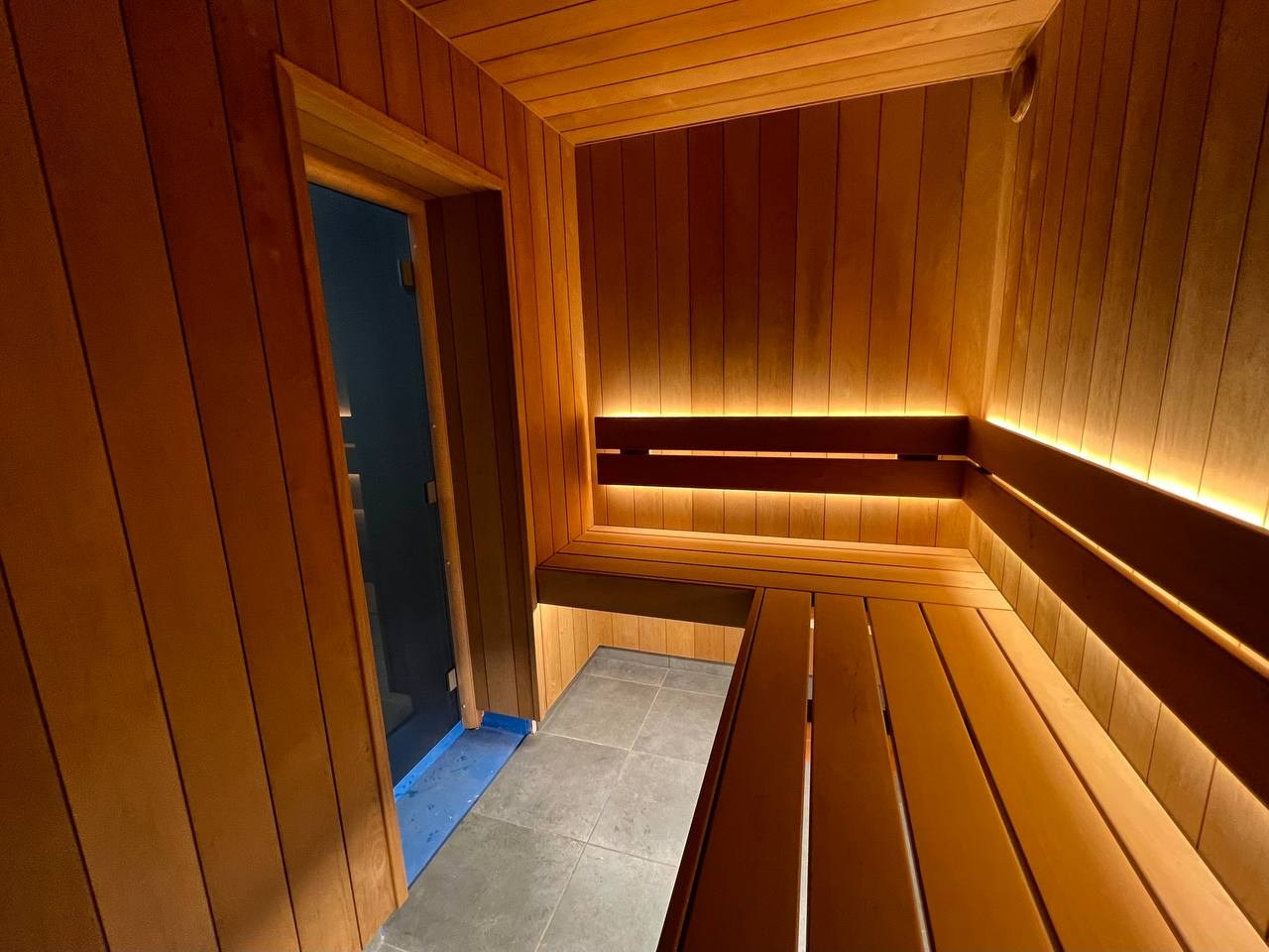 Брутальная парная в КП Газпром из широкой термоольхи и термоабаши. Строгие прямые линии, второе дыхание и невероятная Tulikivi в облицовке