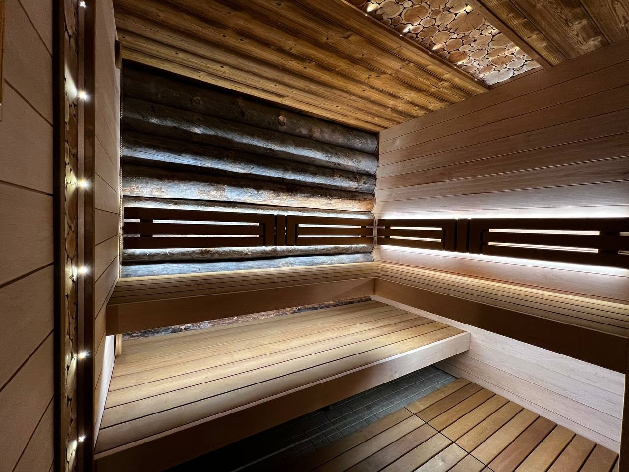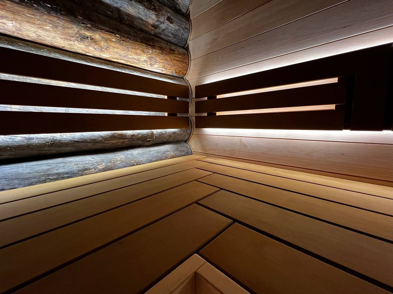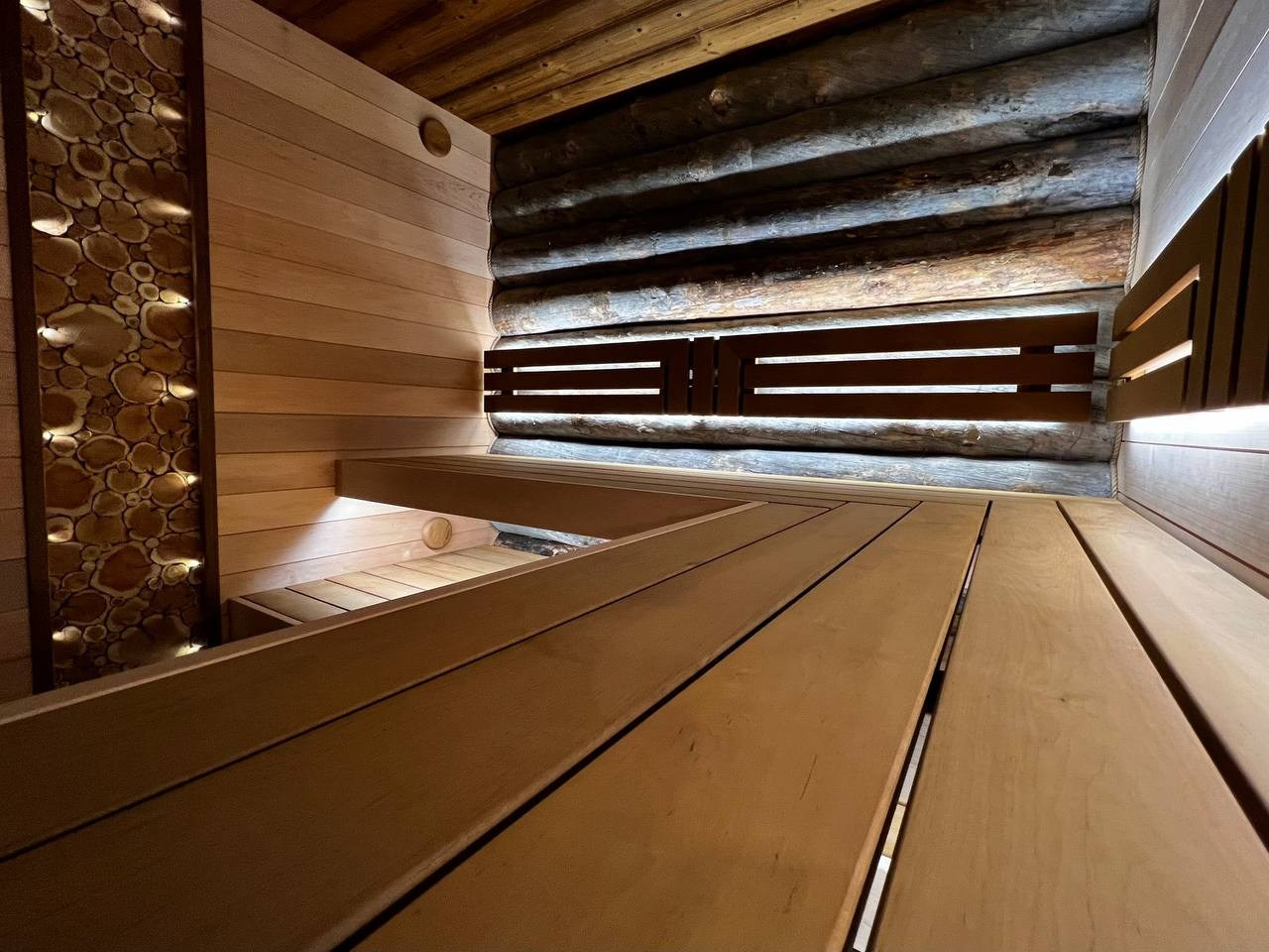 Сауна на Медном Озере из термоольхи «рейка», с тёплой подсветкой, звёздным небом и эффектным IKI Monolith на фоне итальянского камня
