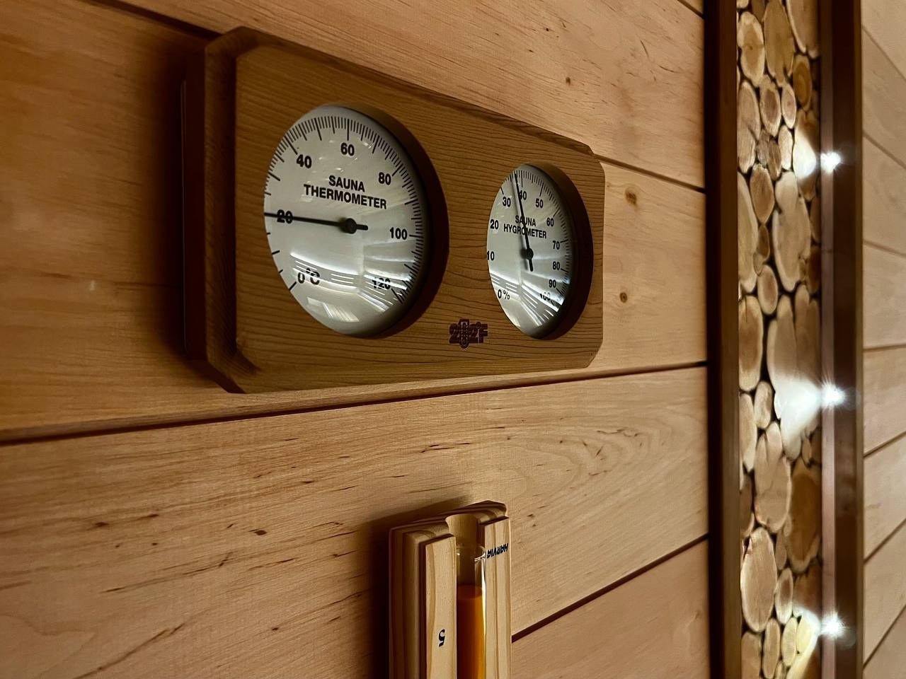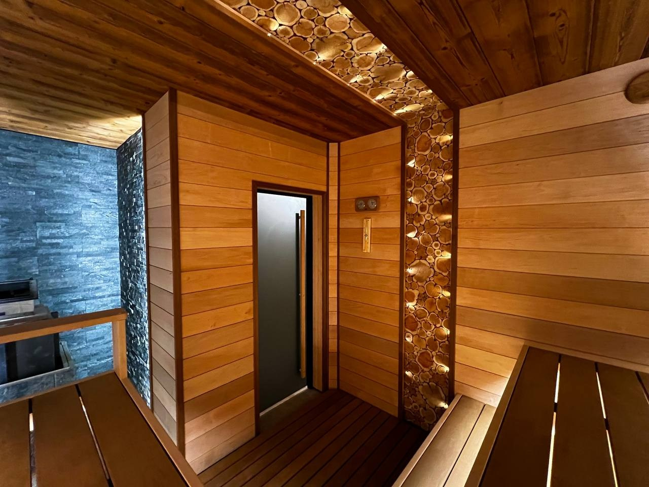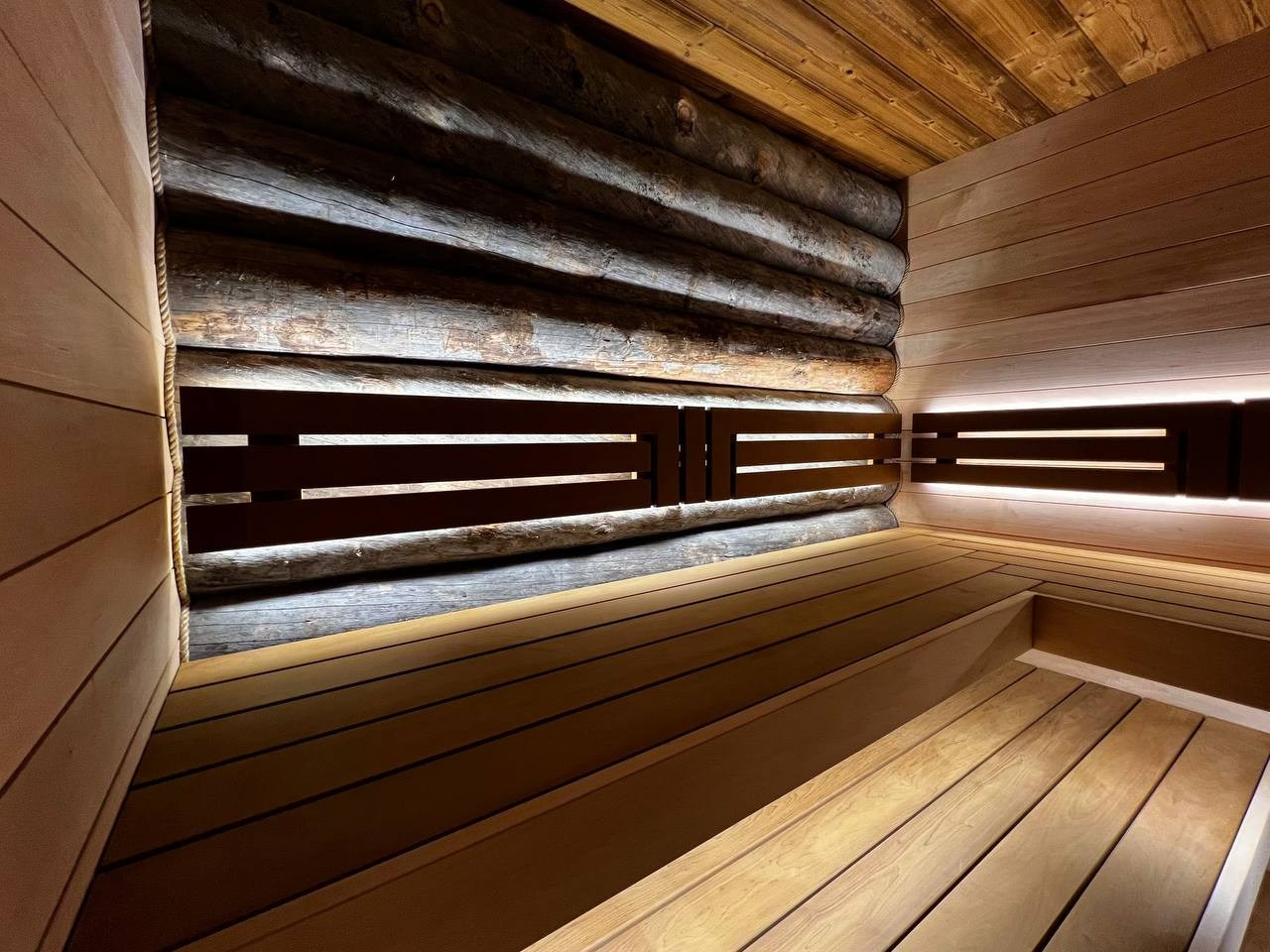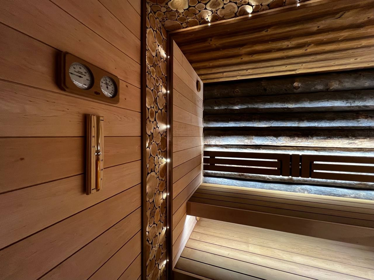 Сауна на Медном Озере из термоольхи «рейка», с тёплой подсветкой, звёздным небом и эффектным IKI Monolith на фоне итальянского камня