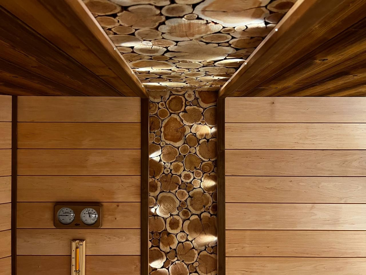Брутальная парная в Озерках выполнена из термоольхи 135 мм. А среди звездного неба красуется панно из срезов можжевельника