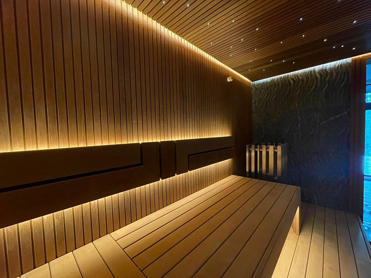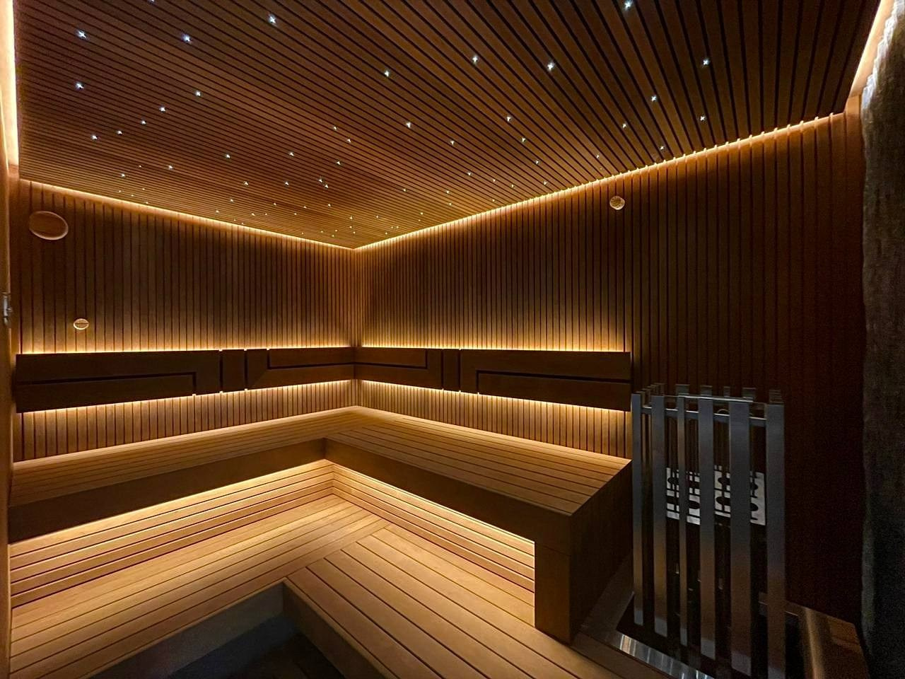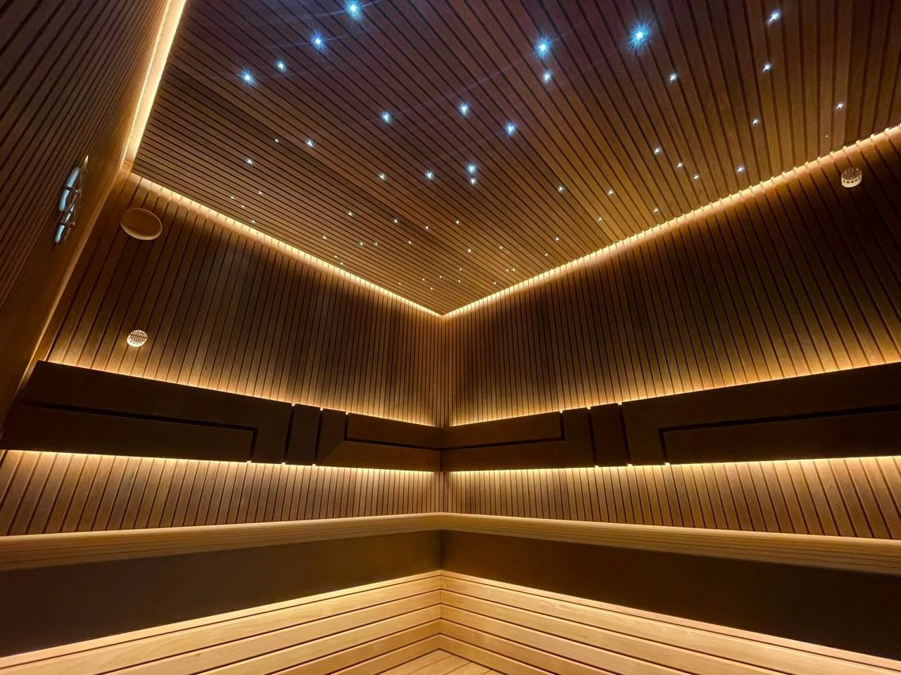 Сауна на Медном Озере из термоольхи «рейка», с тёплой подсветкой, звёздным небом и эффектным IKI Monolith на фоне итальянского камня