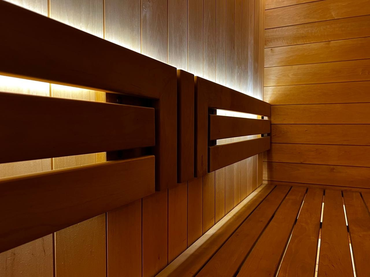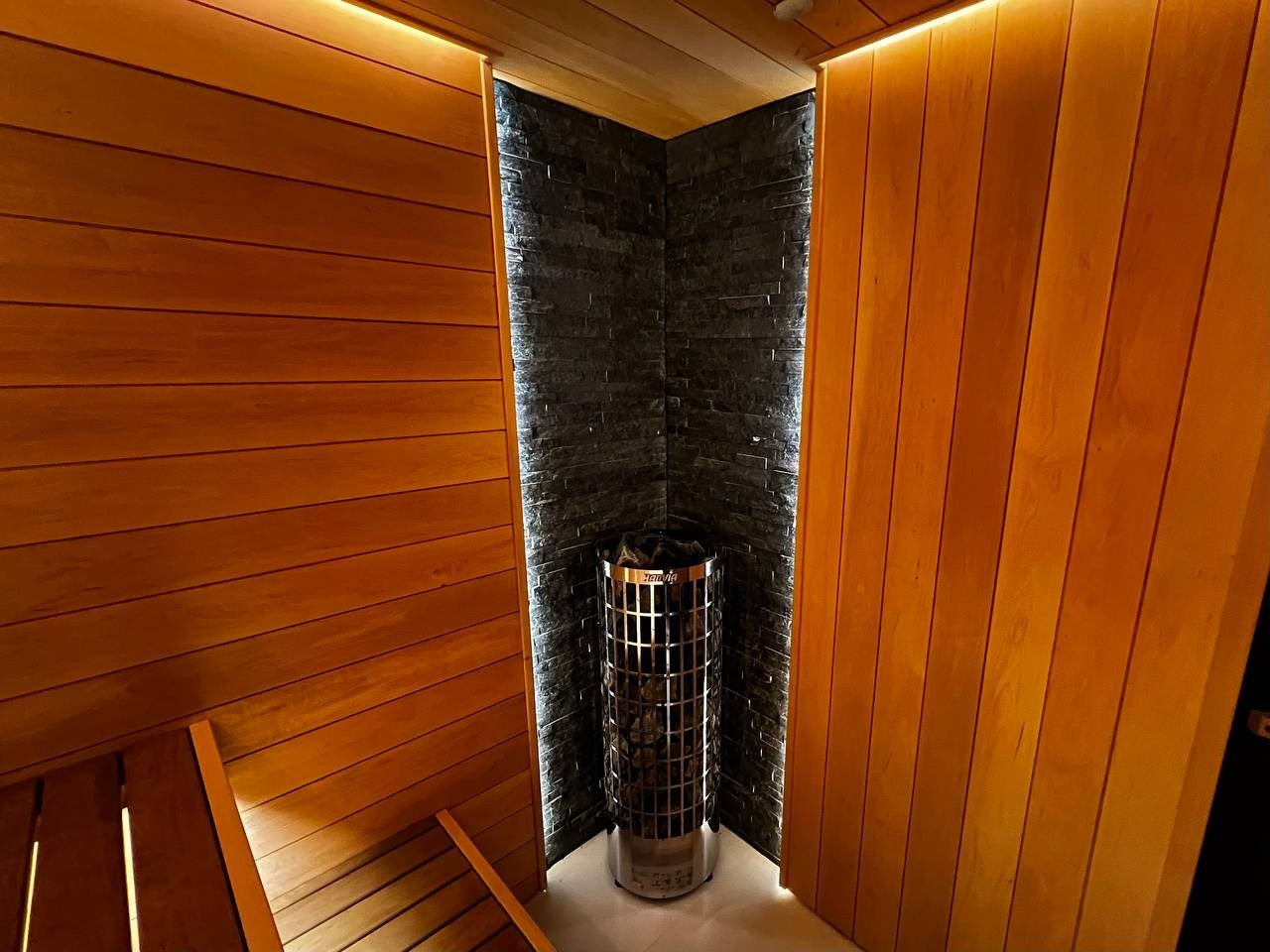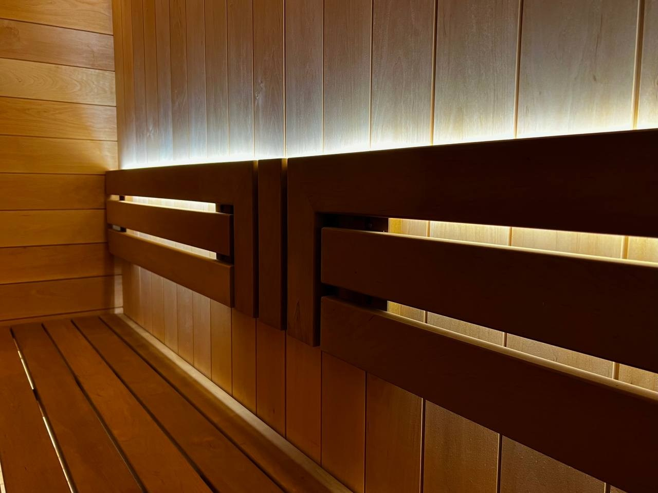 Сауна на Медном Озере из термоольхи «рейка», с тёплой подсветкой, звёздным небом и эффектным IKI Monolith на фоне итальянского камня