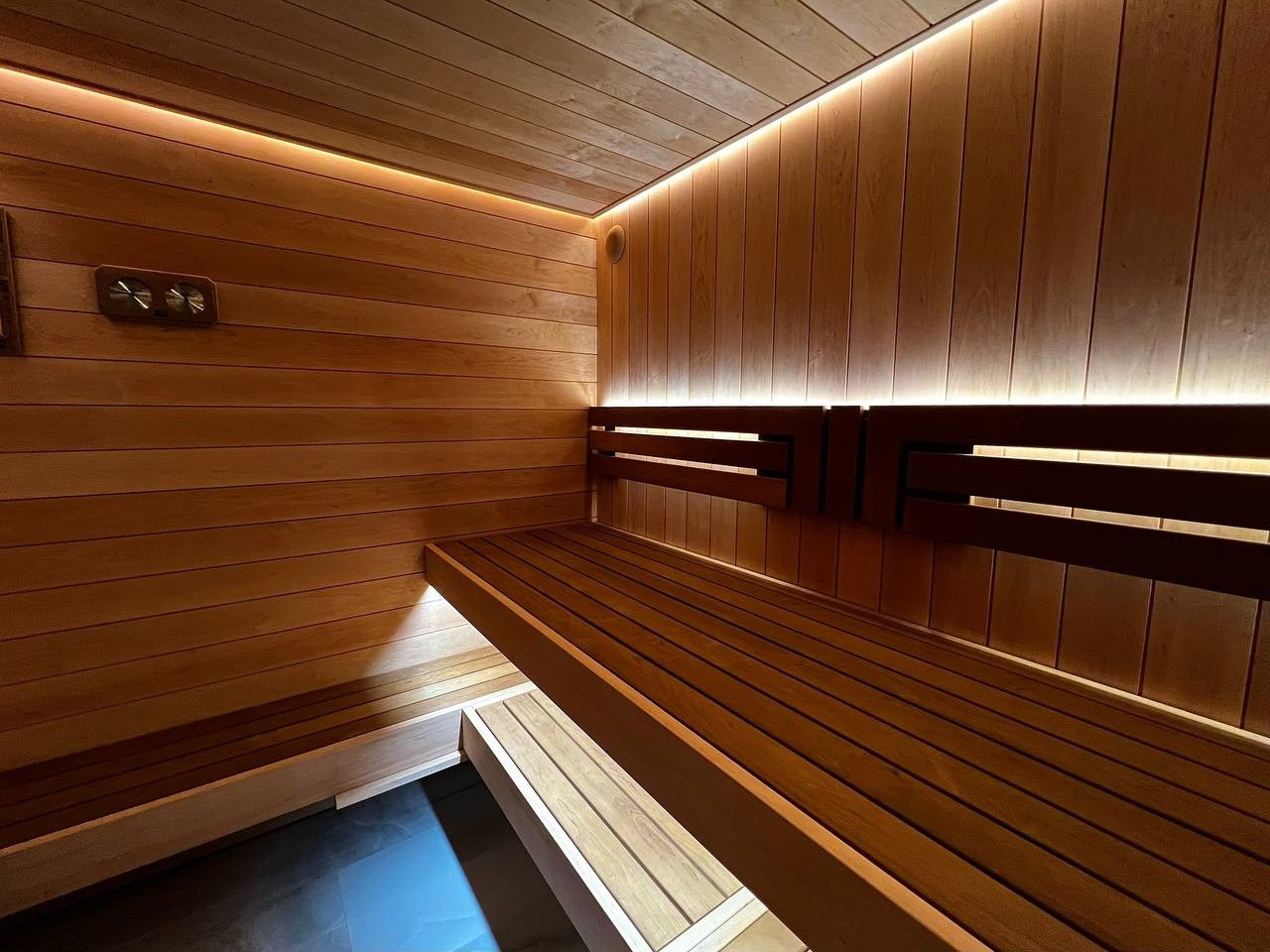 Сауна в Рощино на базе электрокаменки с парогенератором Harvia Virta выполнена из термоольхи с интеграцией световых линий из можжевельника