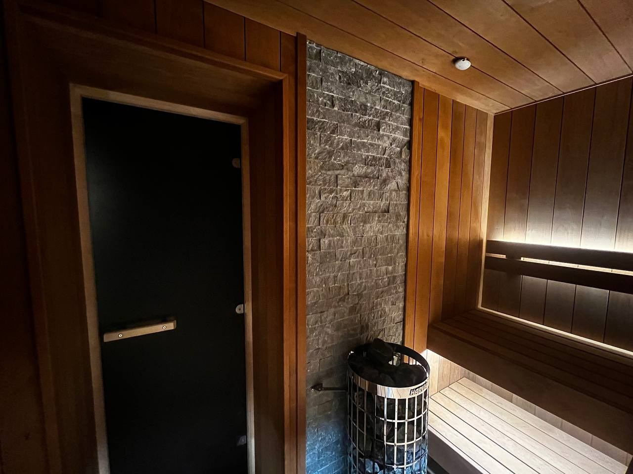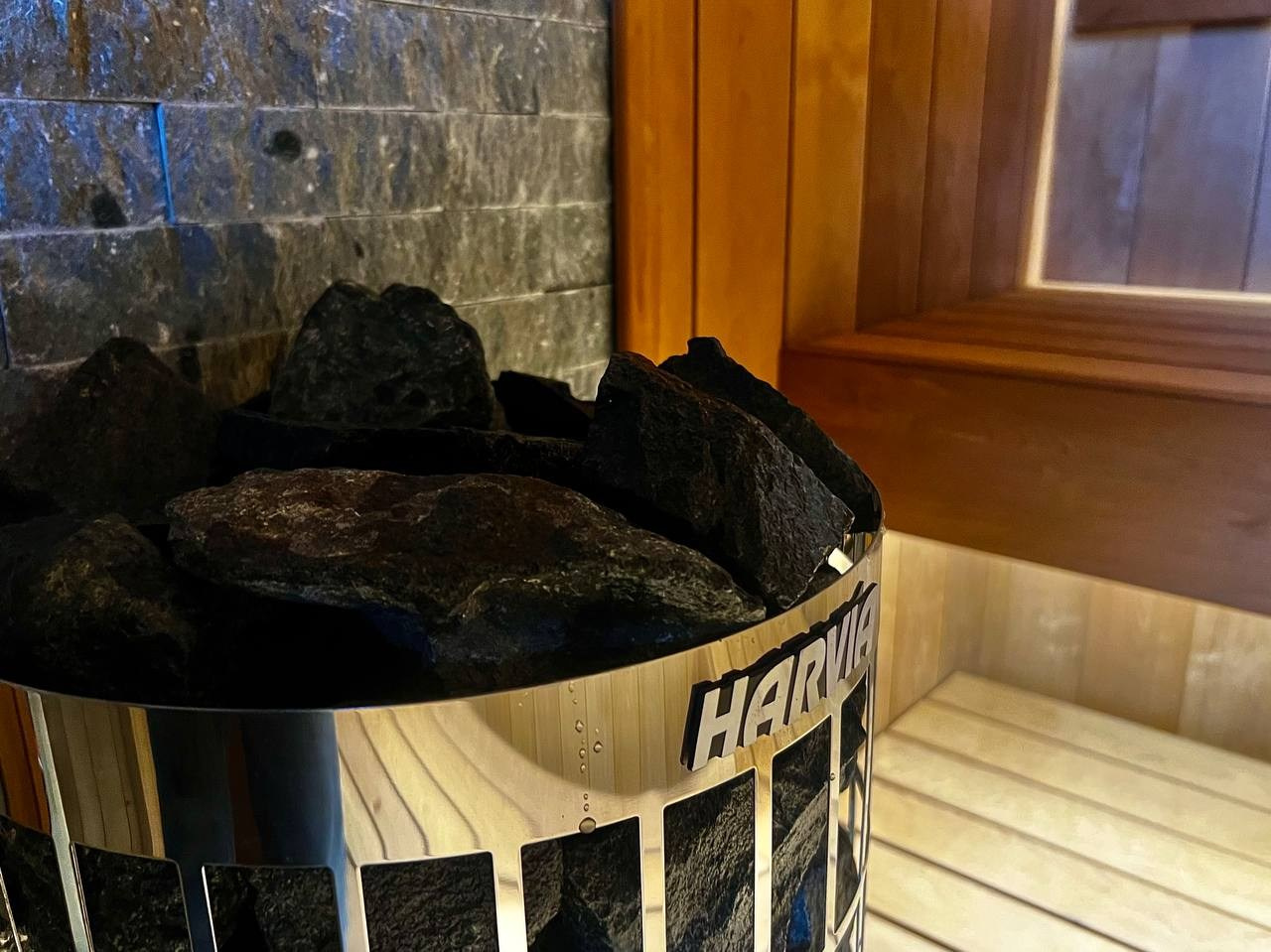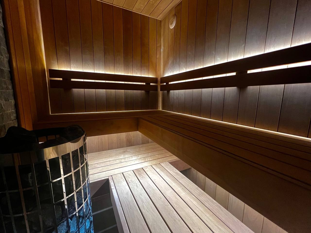 Сауна на Медном Озере из термоольхи «рейка», с тёплой подсветкой, звёздным небом и эффектным IKI Monolith на фоне итальянского камня