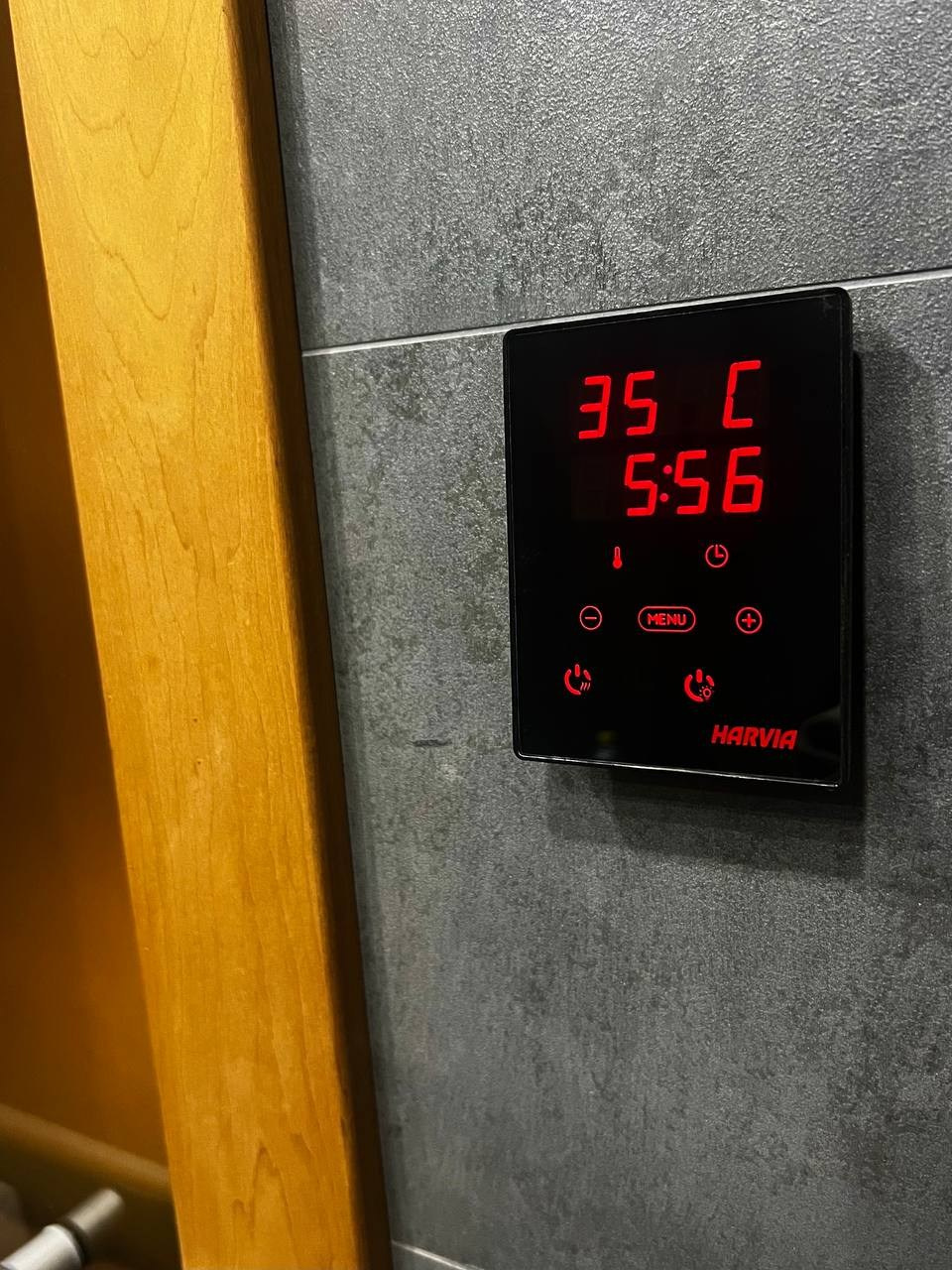 Сауна в Рощино на базе электрокаменки с парогенератором Harvia Virta выполнена из термоольхи с интеграцией световых линий из можжевельника