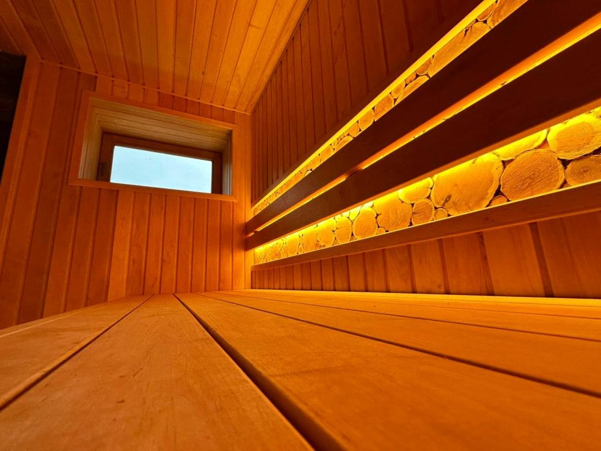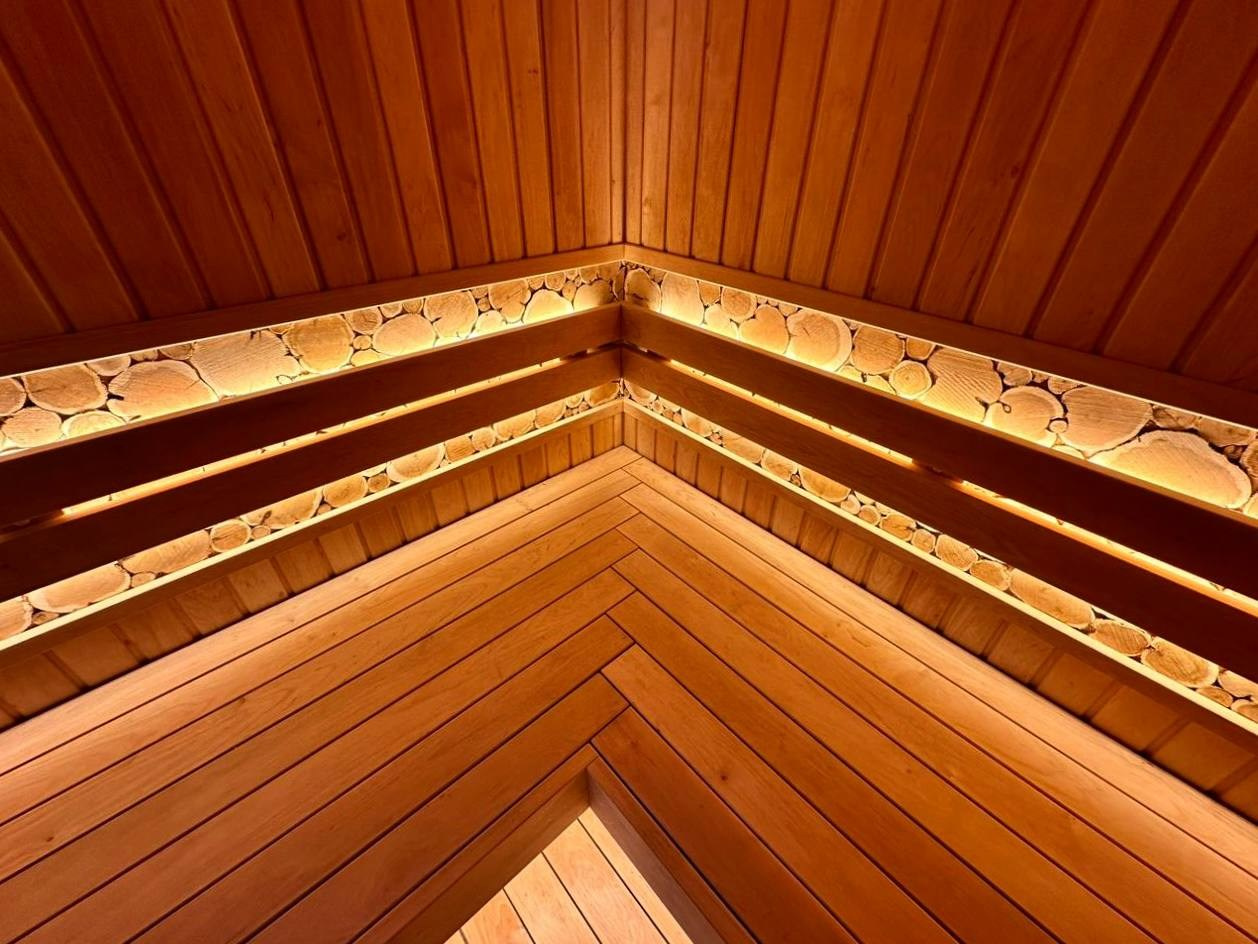 Уютная сауна на берегу реки Сясь в Теребуне: липа, тёплая термоольха и волшебный свет гималайской соли под потолком.