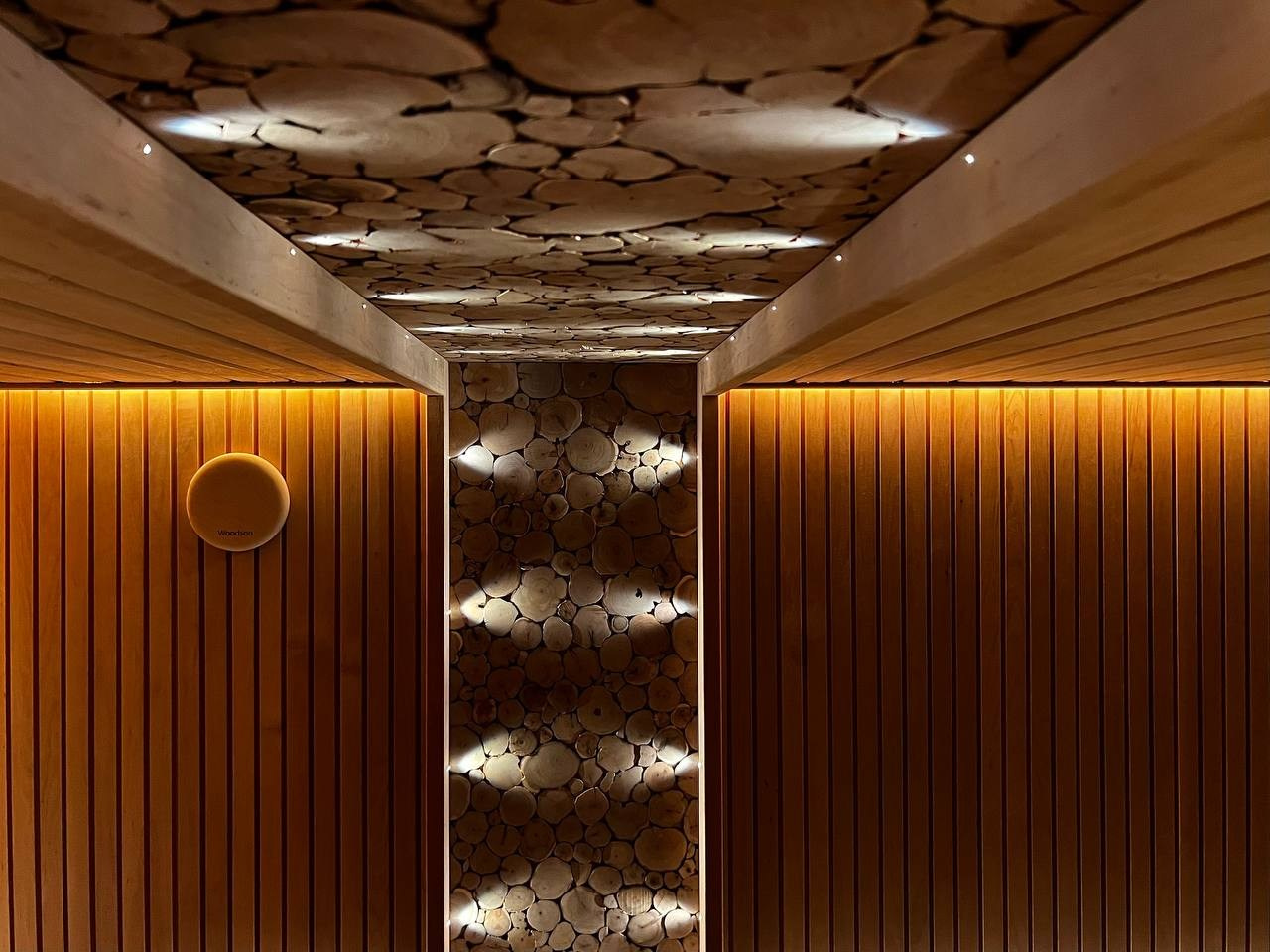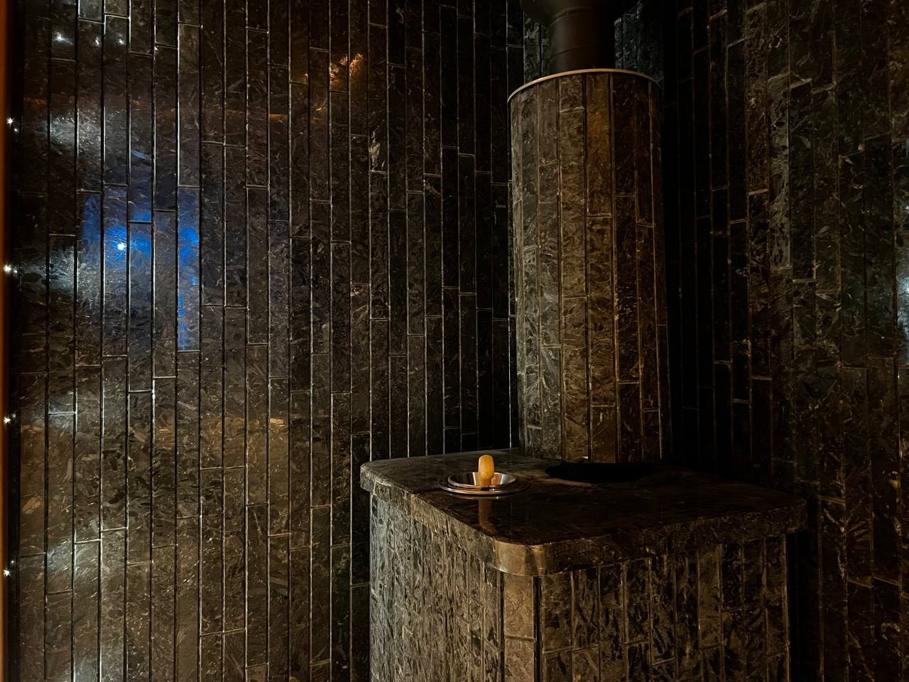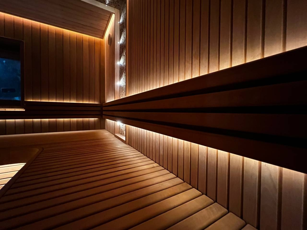 Сауна на Медном Озере из термоольхи «рейка», с тёплой подсветкой, звёздным небом и эффектным IKI Monolith на фоне итальянского камня