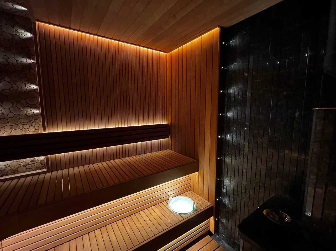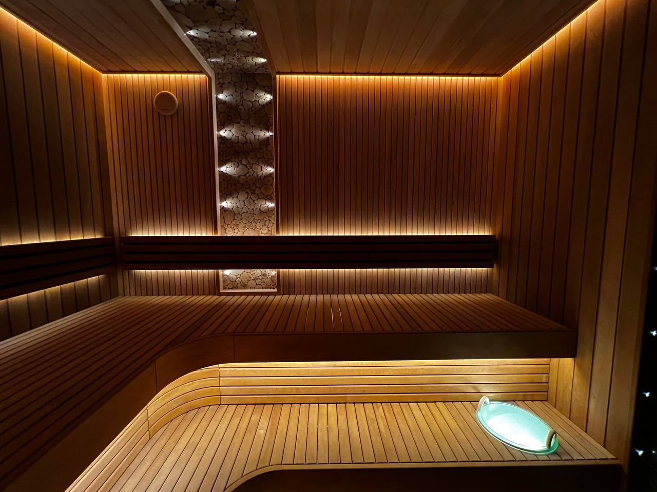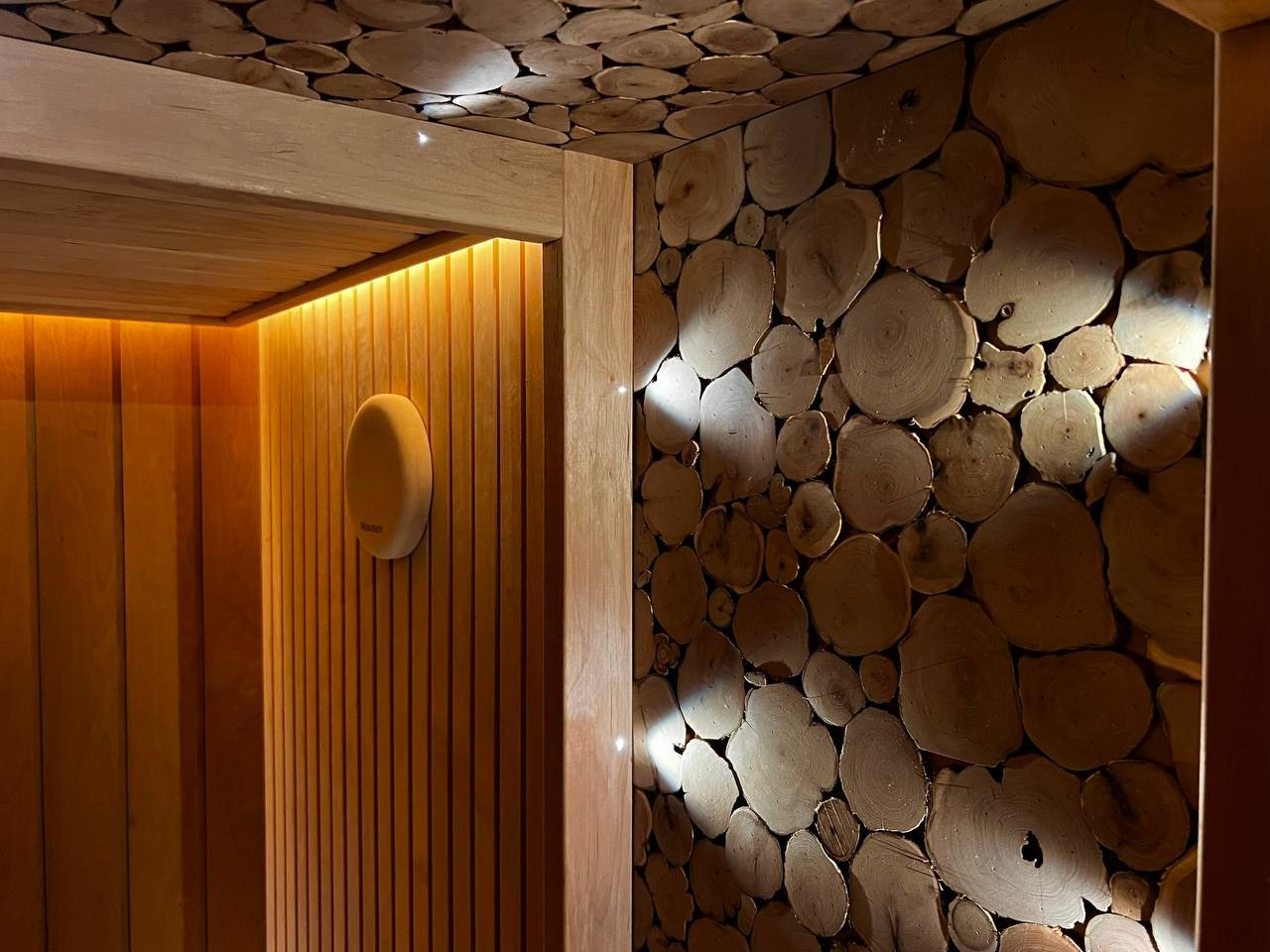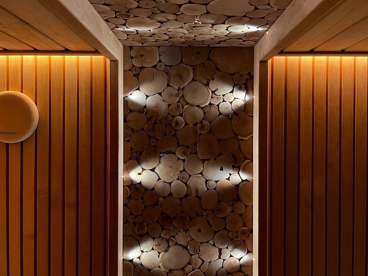 Сауна на Медном Озере из термоольхи «рейка», с тёплой подсветкой, звёздным небом и эффектным IKI Monolith на фоне итальянского камня