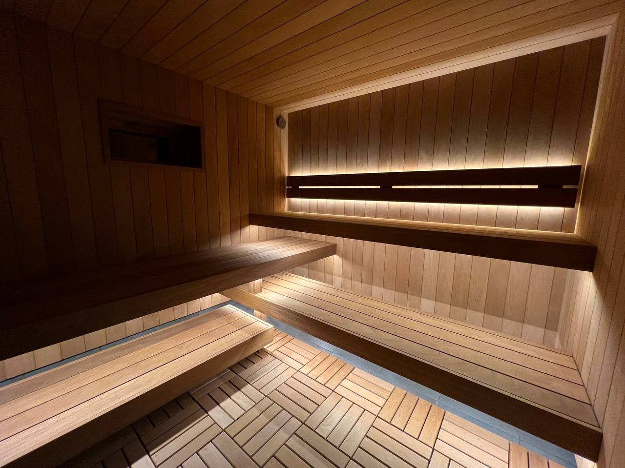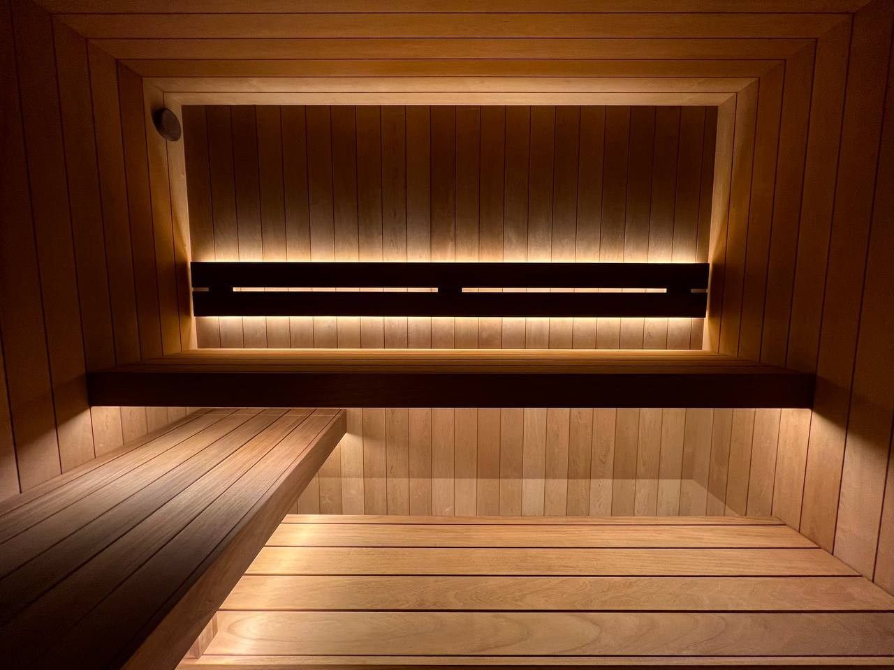 Сауна в Садах Времени на электрокаменке Sangens в облицовке из черного закаленного стекла. Выполнена в классическом стиле нашей команды