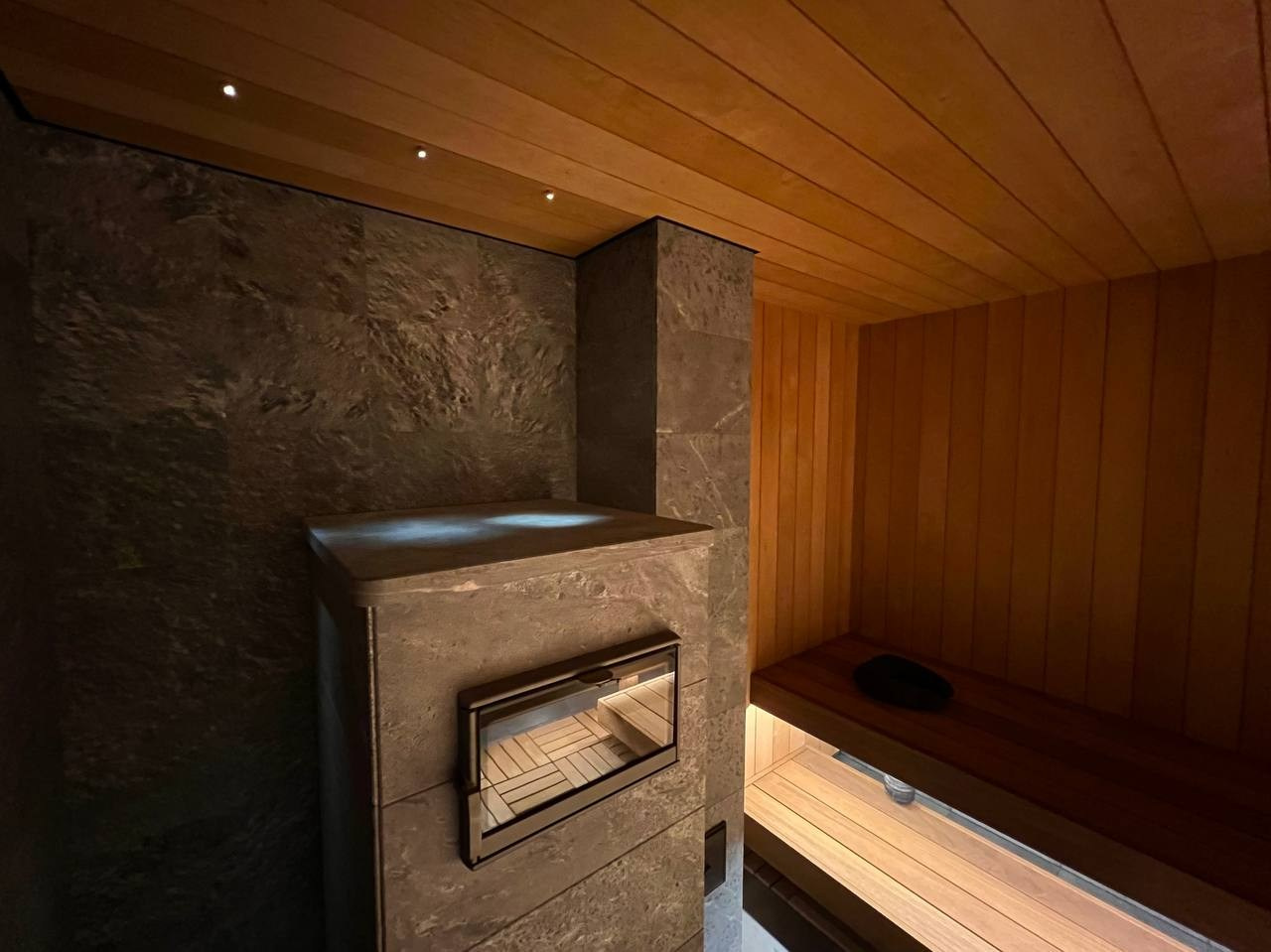 Брутальная парная в КП Газпром из широкой термоольхи и термоабаши. Строгие прямые линии, второе дыхание и невероятная Tulikivi в облицовке
