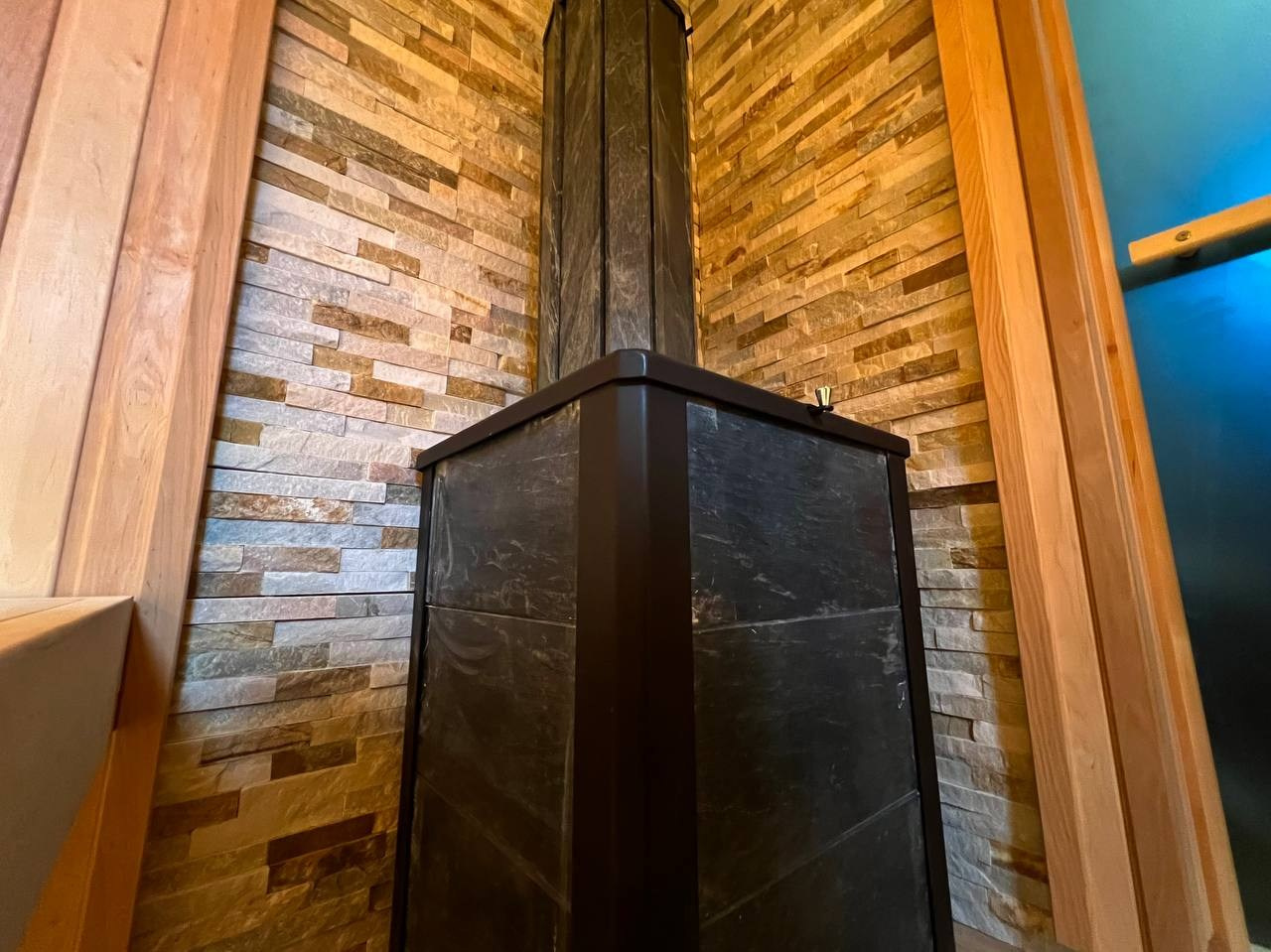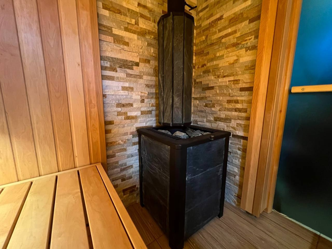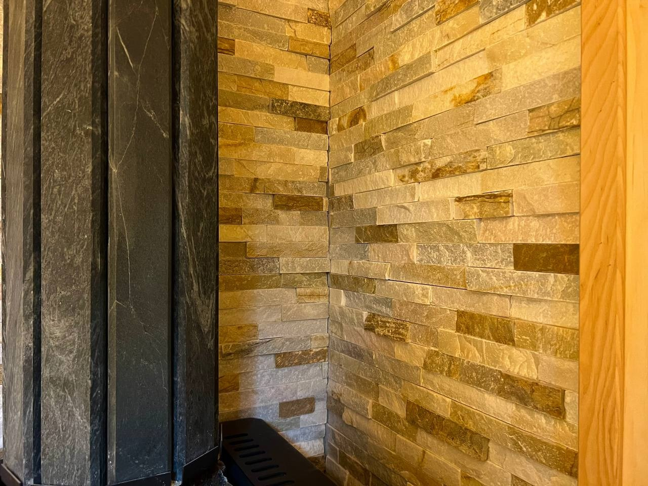 Две симметричные парные в Зеленогорске: ольха софтлайн и каменка Везувий в противопожарном углу из сланца