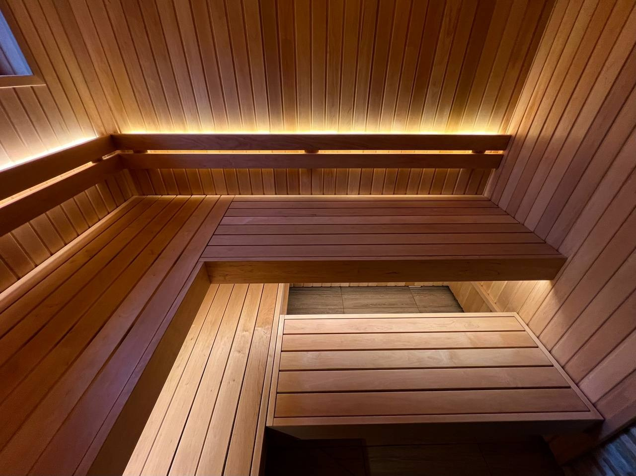 Уютная парная в Glorex Заневский. Компактная, но визуально просторная за счет парящих полков и горизонтального расположения светлой ольхи