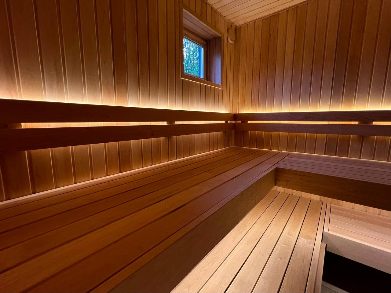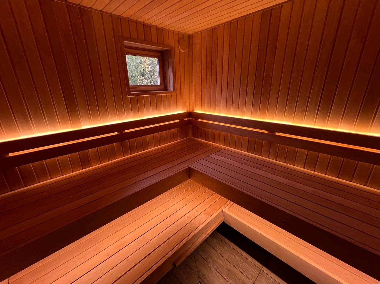 Сауна в Северной Жемчужине выполнена по проекту наших коллег VitaLine SPA. Разнопрофильная ольха, линейный свет и Sangens в редкой облицовке